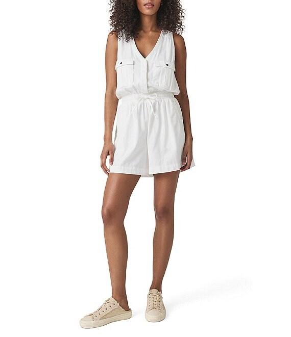 From Splendid, this romper features: Knit fabrication V-neck Sleeveless Functional patch pockets in chest area Elastic waistband with a draw string Half placket button front closure Approx. 4.25" inseam Approx. 18.25" in length Lyocell/cotton/elastane Machine wash Imported.
