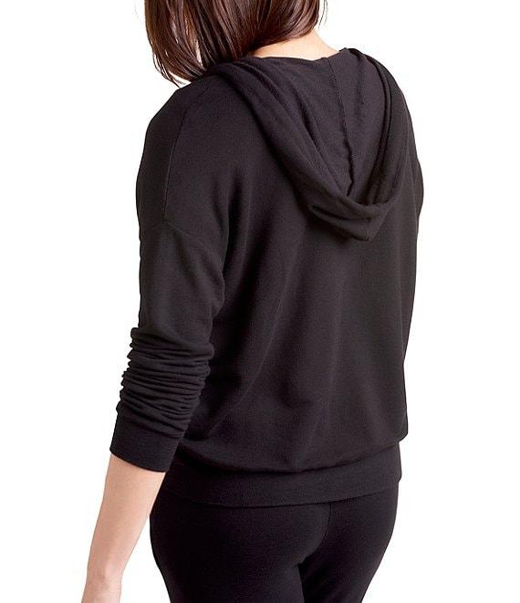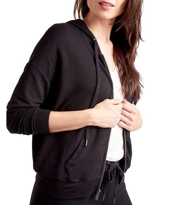 From Splendid, this jacket features: V-neckline Long sleeves Full front zip closure Hoodie silhouette Approx. 22" length Rayon/cotton/spandex Machine wash / line dry Imported.