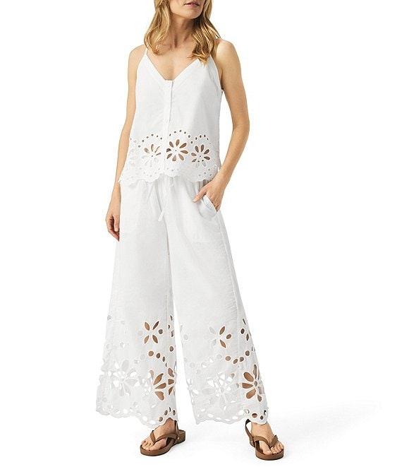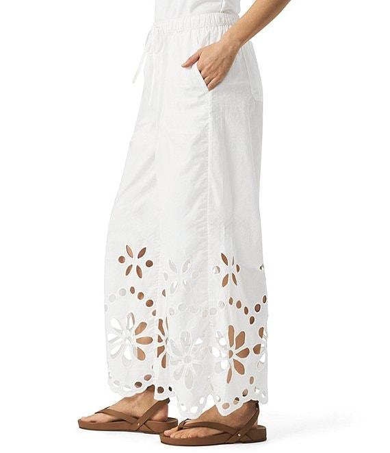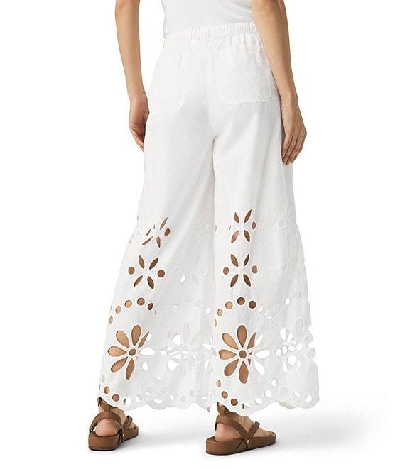 From Splendid, this pant features:Wide leg silhouette Mid rise waist Elastic waistband Drawstring front Side front pockets Laser eyelet detailsScallop embroidery placed on hemlinePull on constructionApprox. 24.5" length Cotton Machine washImported.