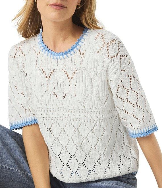 From Splendid, this top features: Crochet knit fabrication Crew neckline Short sleeve Contrast trim Straight hemline Pullover construction Approx. 20.25" in length Cotton Dry clean only Imported.