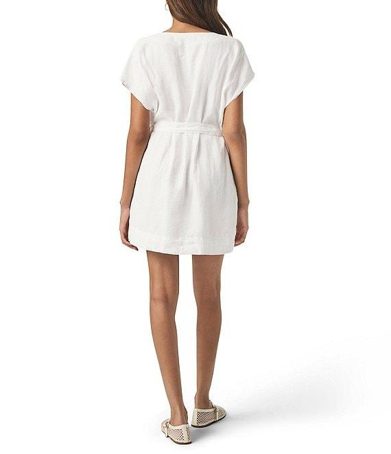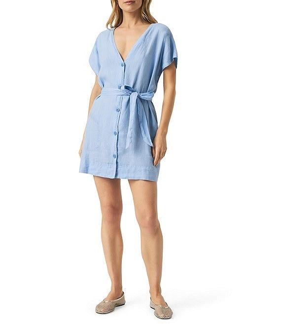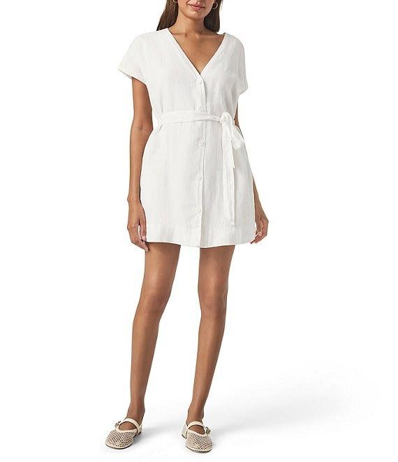 From Splendid, this dress features: Knit fabrication Shirt dress silhouette V-neck Short sleeve Self tie belt Straight hemline Button front full closure Approx. 34.5" in length Linen Machine wash Imported.