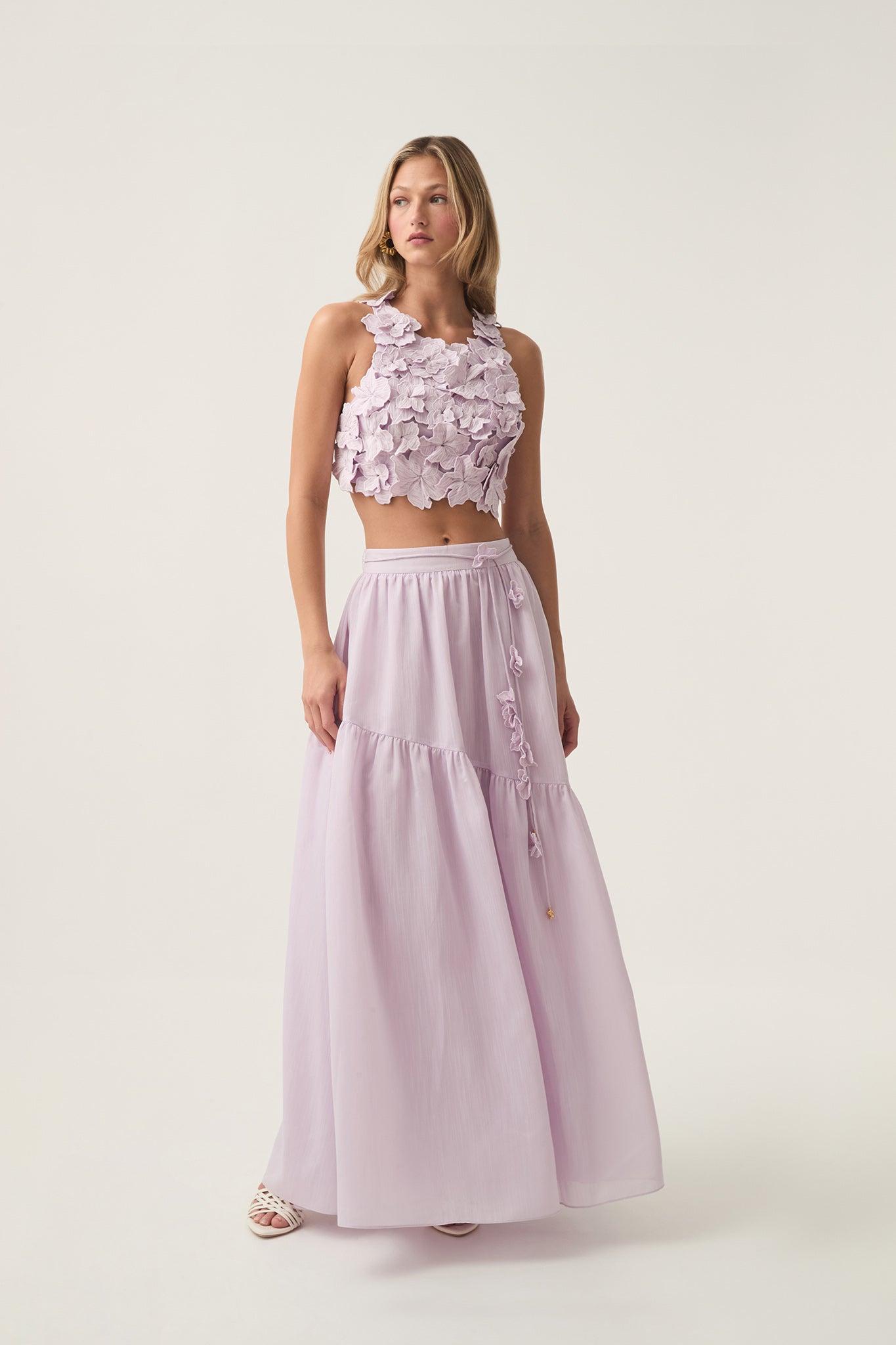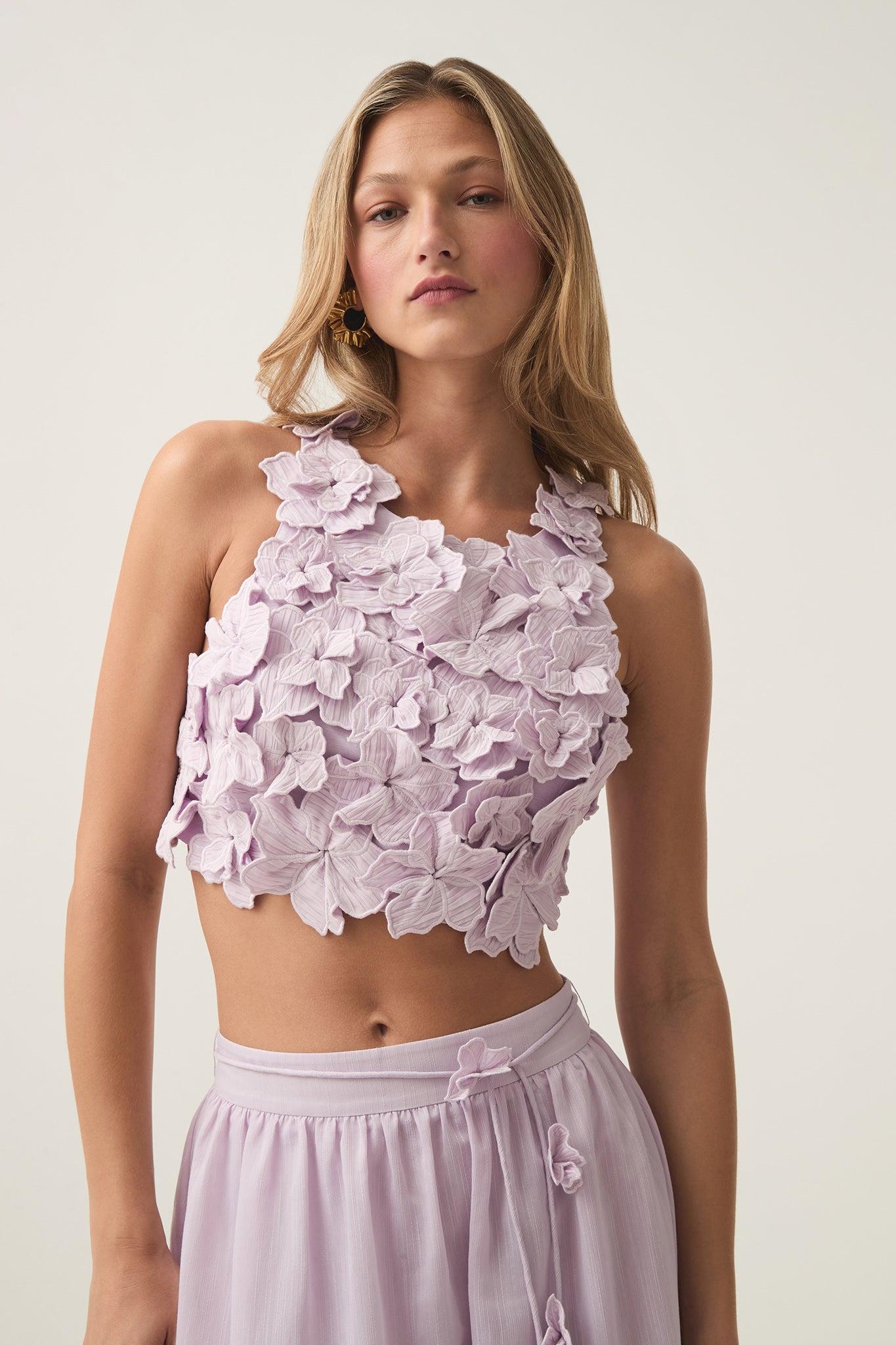 PRODUCT DETAILS Women's crop top High neckline Embellished floral detail throughout Back cut-out with button and clasp closure Lined 65% Linen, 35% Viscose Shop All Tops SIZE AND FIT Model wears a size AU 8/S Height: 175cm/ 5’9 Bust: 81cm Waist: 60cm Hips: 89cm