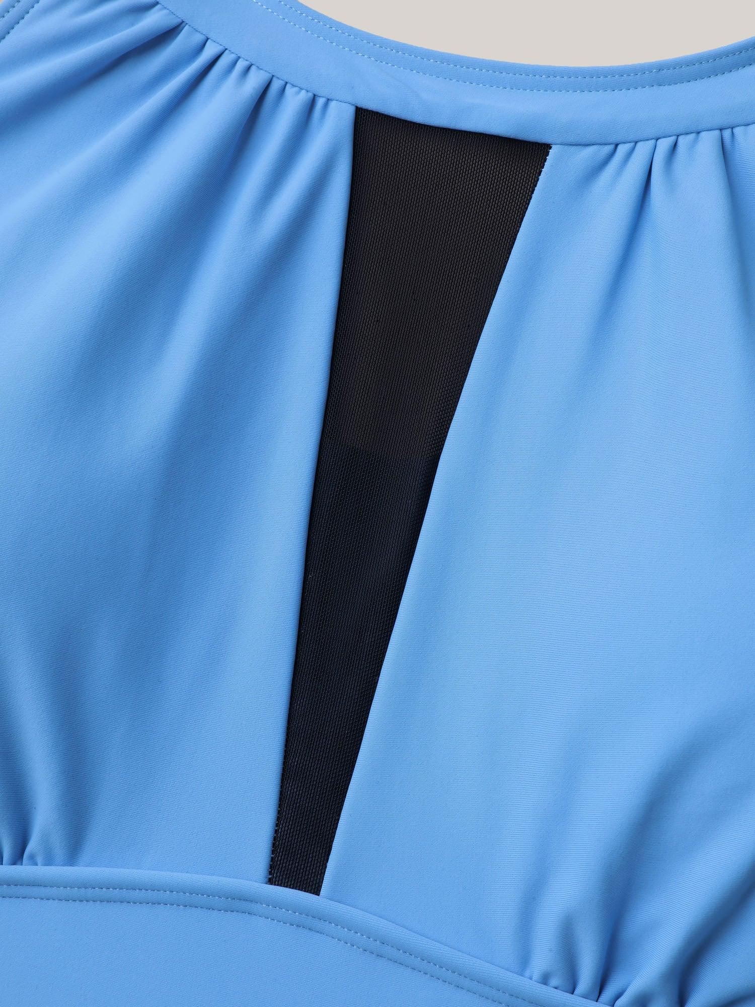 Shop Spliced Color Block Ruched One-Piece Swimsuit now and redefine your style with confidence at BloomChic. Tailored for mid and plus-size women. This trendy Swimwear Women, sizes 10-30. Color:Skyblue;Style:Beach;Cup Type:Removable cups;Coverage:Full;Neckline:U-neck;Sleeve Type:Sleeveless;Prints:Geometric & color block;Details:Contrast, Patchwork, Gathered, See through;Pocket:No-pocket;Belt:No-belt;Chest pad:Removable Padding;Lining:Lining;Closure Type:Non;Structural function:Tummy-Sculpt,Adaptive-Fit
