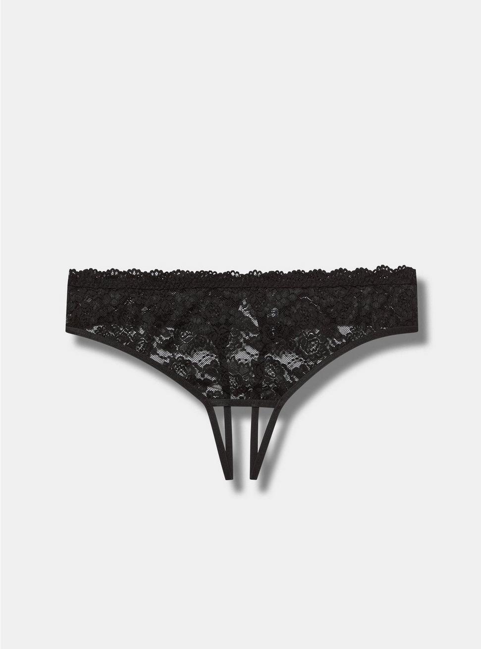 FITMid rise. Minimal coverage.Open gusset.MATERIALS + CARELace knit fabric.95% nylon, 5% spandex.Machine wash cold. Dry low.Imported.DETAILSLace trim detail.
