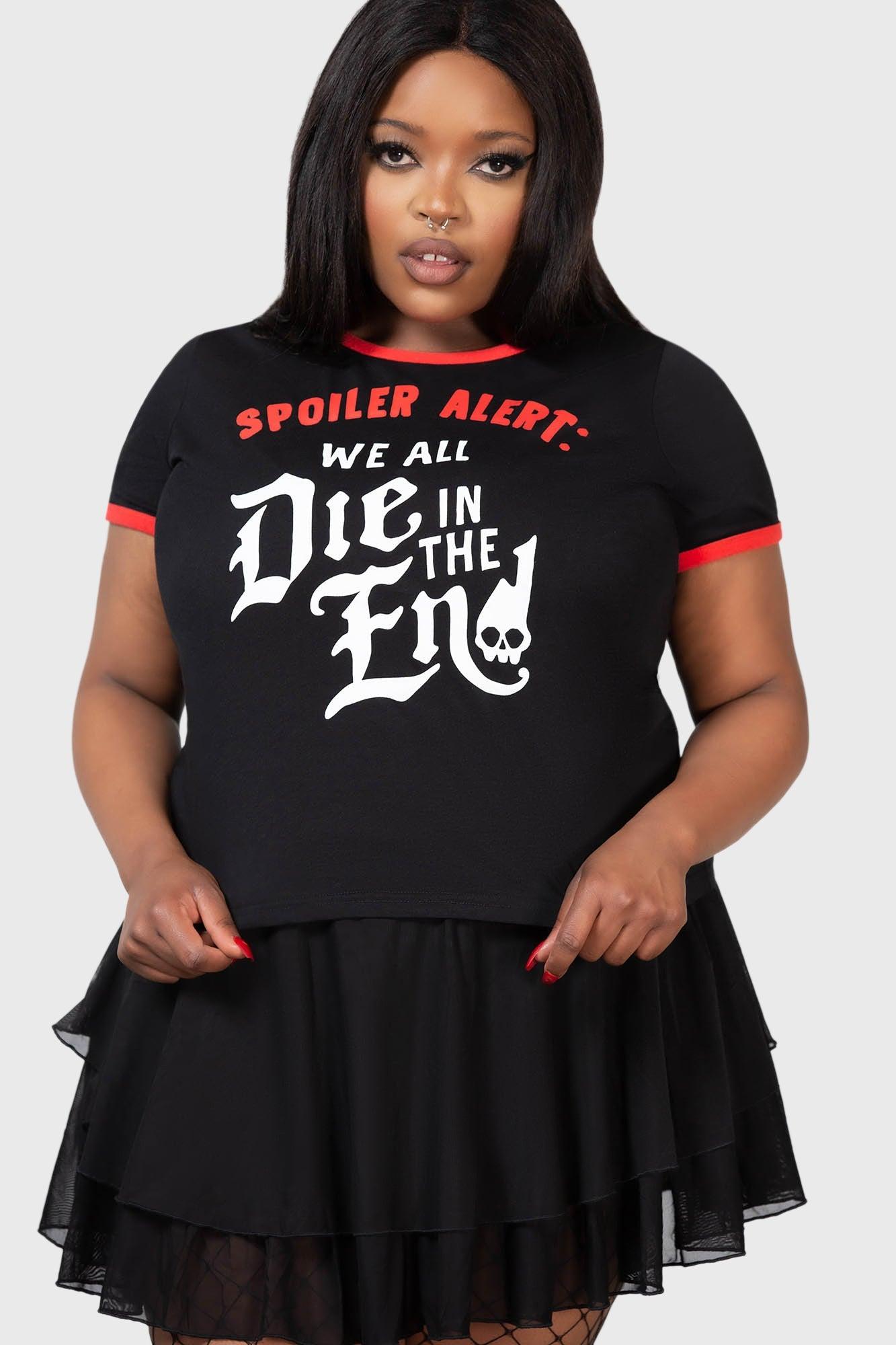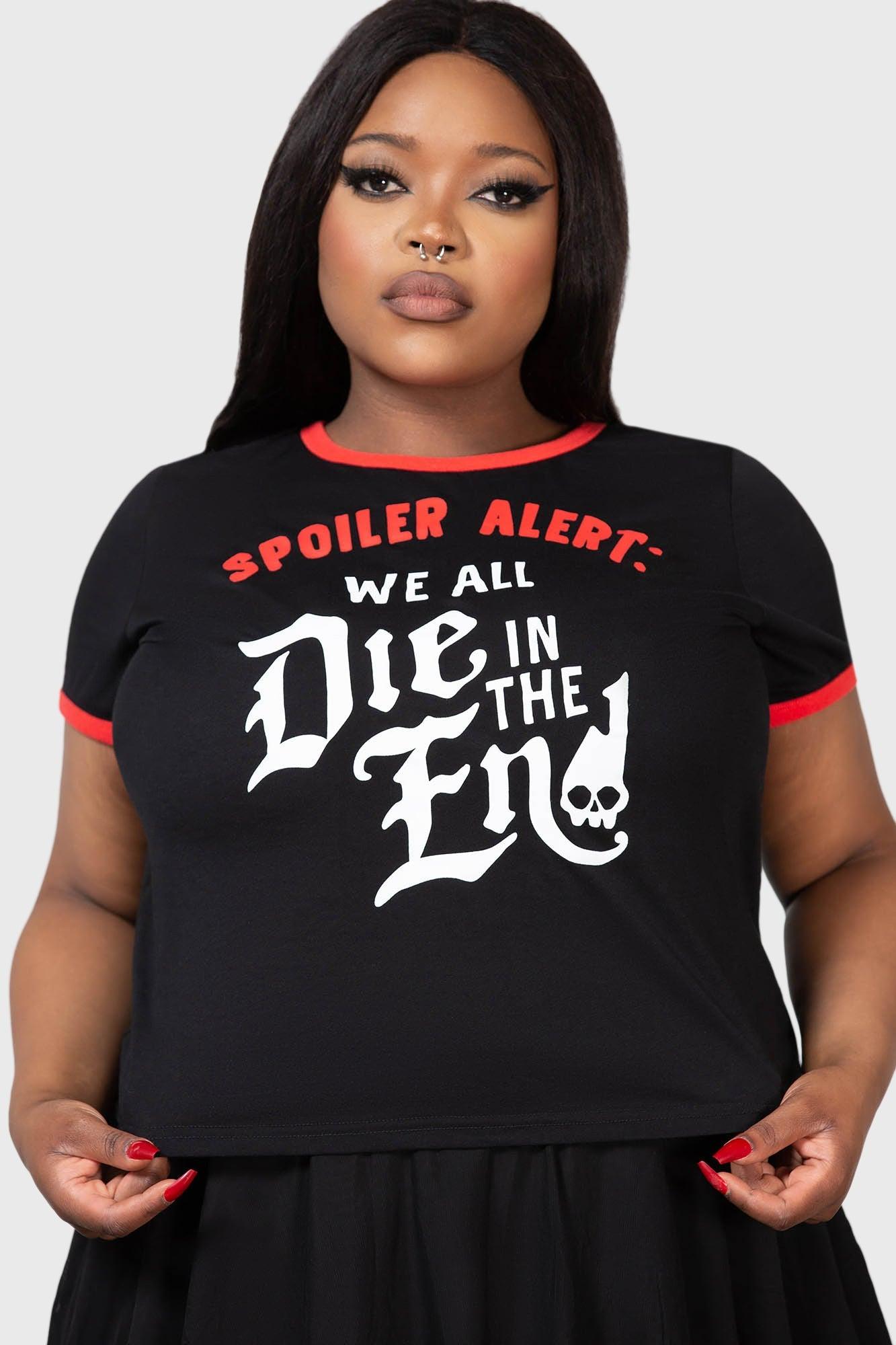 SPOILER.- Soft, stretch cotton fabric.- Statement graphics.- Text reads "Spoiler alert, we all die in the end"- Crew neck.- Contrasting cuffs and neck detail.- Short sleeves.- Fitted.100% Cotton.Machine wash cold / Do not tumble dry / Do not dry clean / Iron on reverse / Wash with similar colours. Imported.