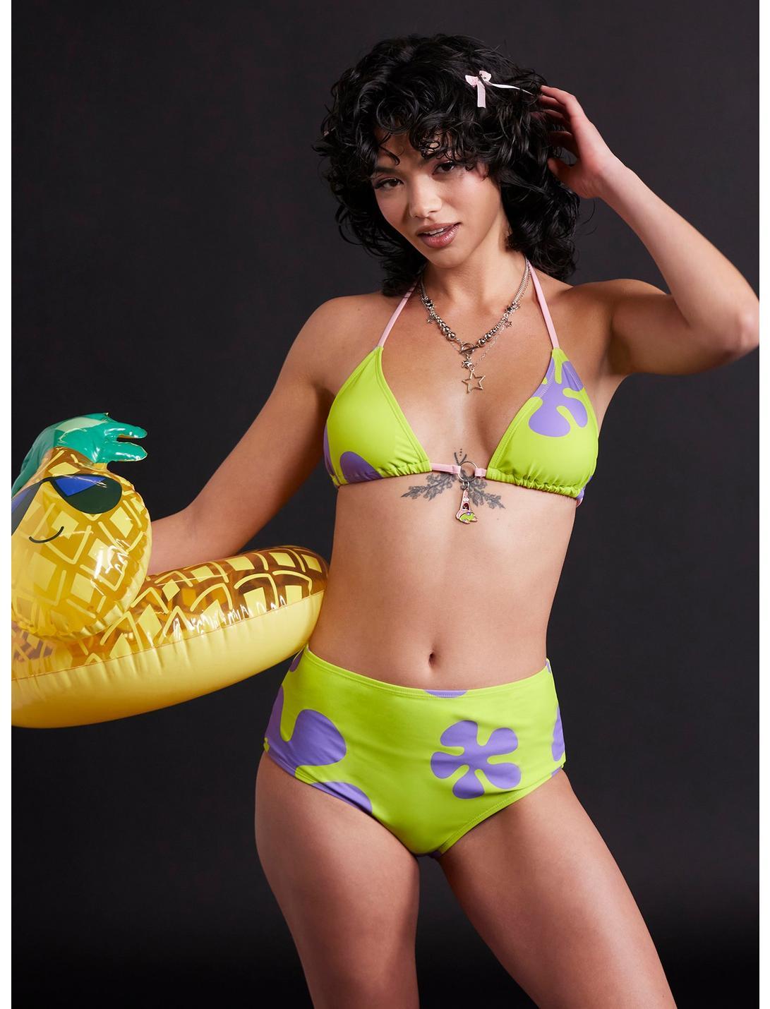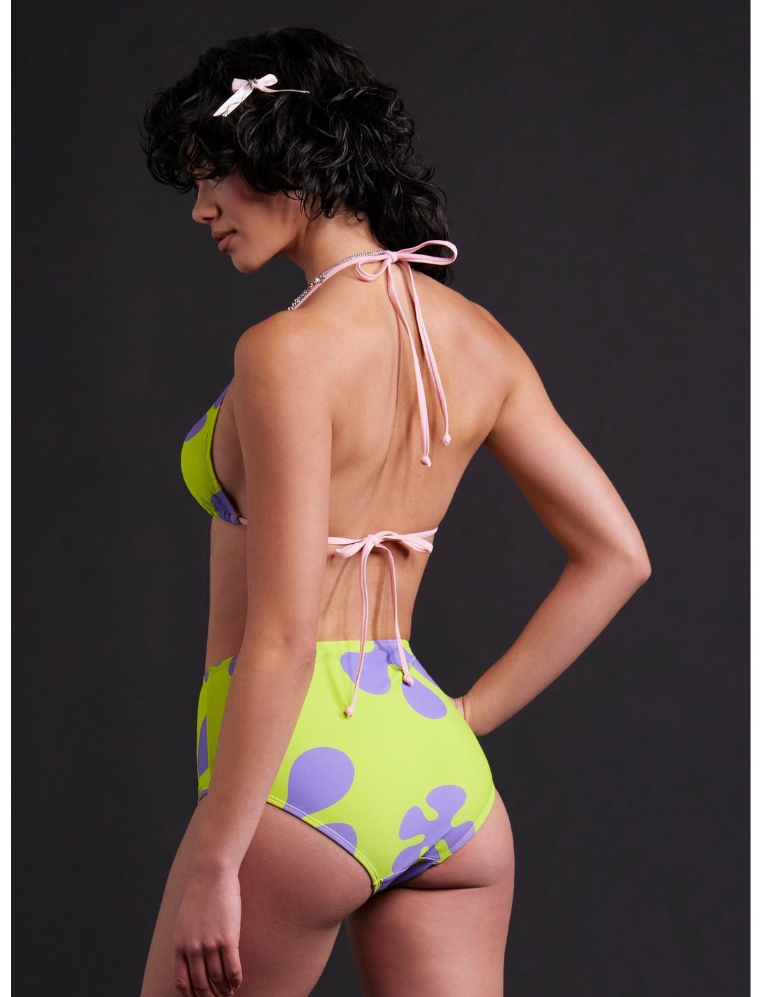 Chill poolside with some serious Bikini Bottom vibes! This SpongeBob SquarePants swim top features a print inspired by Patrick's shorts and a Patrick charm dangling from an O-ring accent. Designed with halter and back ties. Comes with removable padding. Pair it with the matching bottoms for the ultimate summer vibe!Bottoms not included.Swimwear can only be returned unworn with original tags intact and sanitary panel in place.82% nylon; 18% spandexHand wash cold; dry flatRemovable paddingImportedListed in junior sizesModel wears size Medium