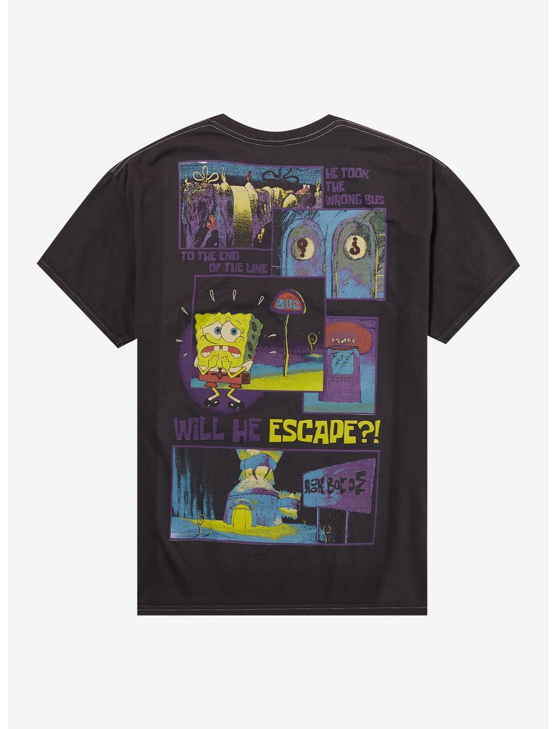 Hurry! The next pfft bus pfft leaves in pfft... 5 seconds. Get outta Rock Bottom with this SpongeBob SquarePants tee on, featuring double-sided prints from the episode, including the creepy residents of Rock Bottom lurking behind SpongeBob and his Glove World flashlight printed on the front.100% cottonWash cold; dry lowDouble-sided printImportedListed in men's/unisex sizes