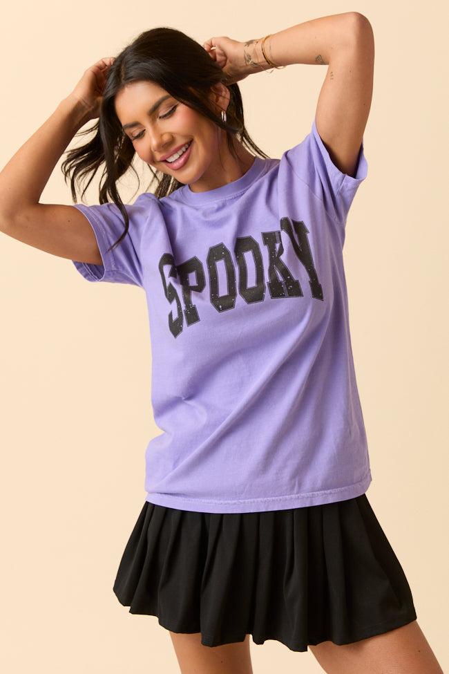 Details Purple crewneck with spooky design Crew neckline Short sleeves Material and Care Comfort Color Tee 100% cotton For best results, wash inside out on a gentle cycle with cold or lukewarm water. Tumble dry low or hang to dry to keep your tee looking fab! Size and Fit Size Small approximate measurements. Relaxed fit, size up 2 sizes for oversized fit Chest Width: 17.25” Body Length: 25.6”
