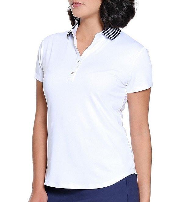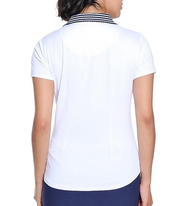 From Sport Haley, this top features: Stretch fabrication V-neck crossover snap placket neckline Short sleeves Front snap placket closure Polo silhouette Stripe rib collar with scalloped edge neckline 50+ UPF sun protection Moisture wicking Approx. 25.5" length Polyester/spandex Machine wash Imported.