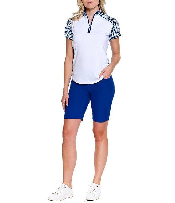 From Sport Haley, this top features: printed yoke, collar, and sleeves banded collared neckline short sleeves center front quarter zip closure polyester/spandex machine wash, tumble dry Imported.
