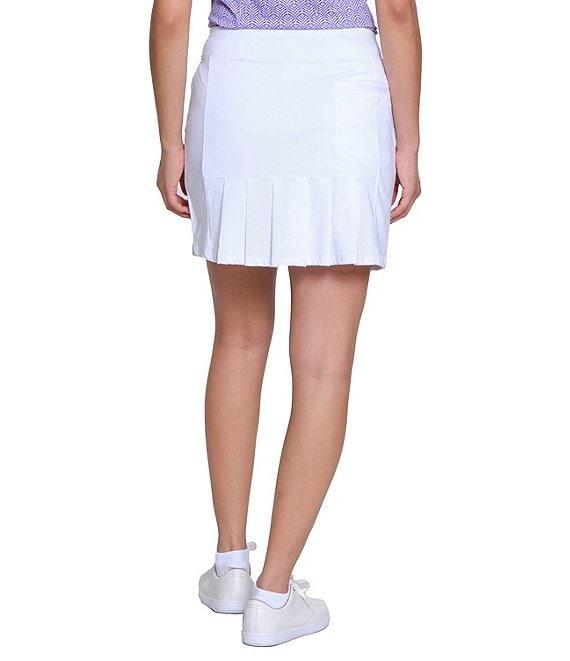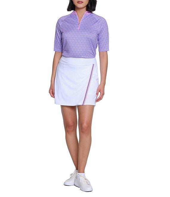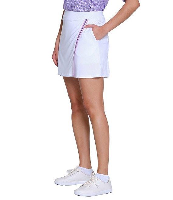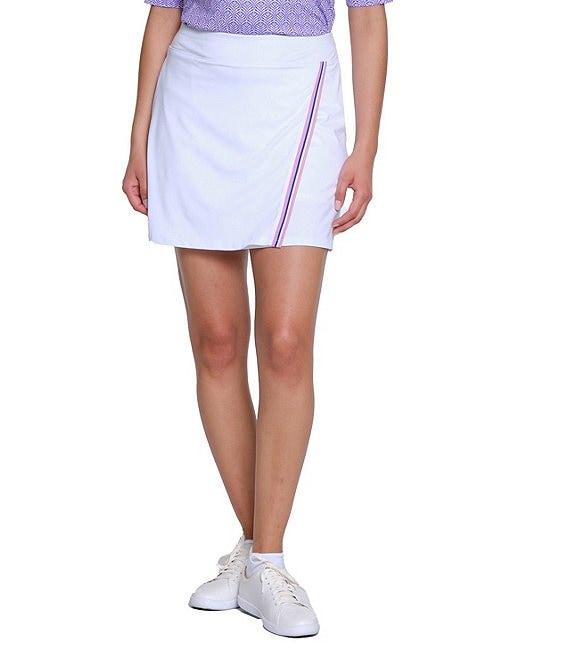 From Sport Haley, this skirt features: Moisture wicking, stretch fabrication Elastic waistband Angled stripe trim detail Regular fit Two front pockets and one back pocket Straight hemline Liner included 50+ UPF sun protection Pull-on construction Approx. 16" length Polyester/spandex Machine wash/tumble dry Imported.