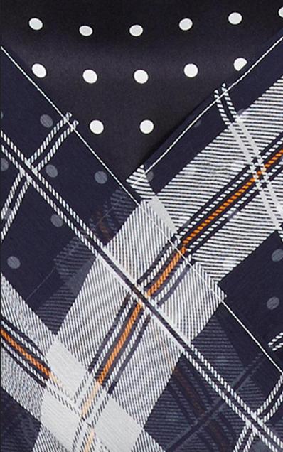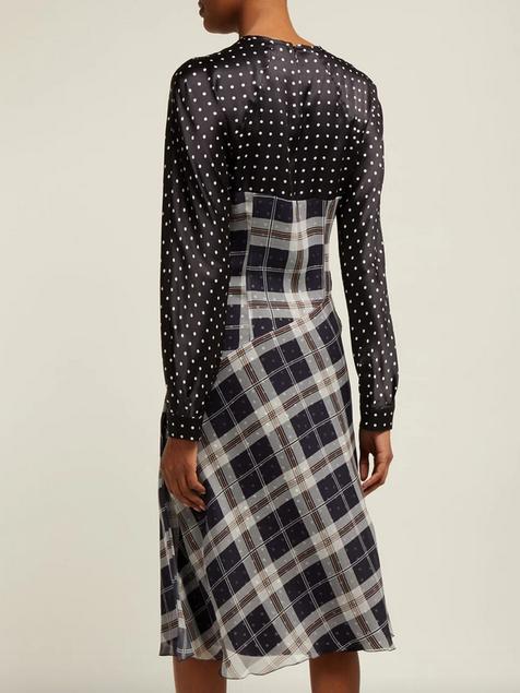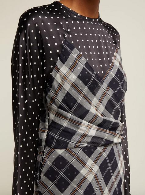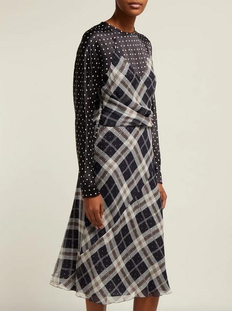 A beautiful dual fabric Poltava silk dress by Sportmax. Black and white satin body overlaid with chiffon tartan. Concealed side and back zip closure, flouncy bias cut skirt, mock wrapover detail on the bust, round neck, long raglan sleeves with small rouching on the shoulders. Length 116cm.