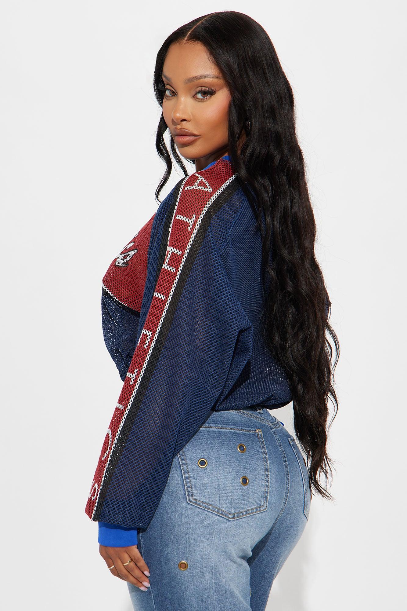 Available In Navy/combo. Jersey Long Sleeve Crew Neck Cropped Graphic Solid Print Disclaimer: Due To The Screen Printing Process A Difference In Saturation May Occur. Each Garment Is Unique. 100% Polyester Imported