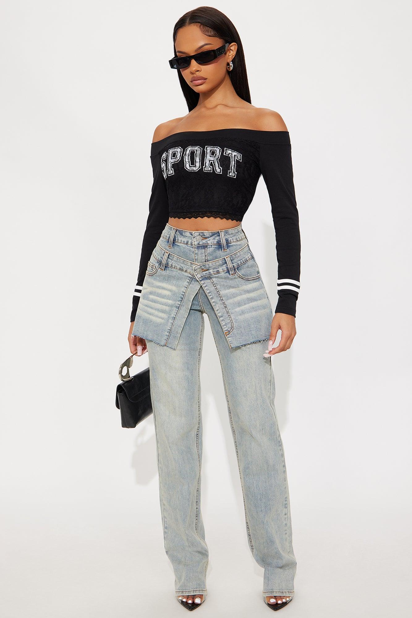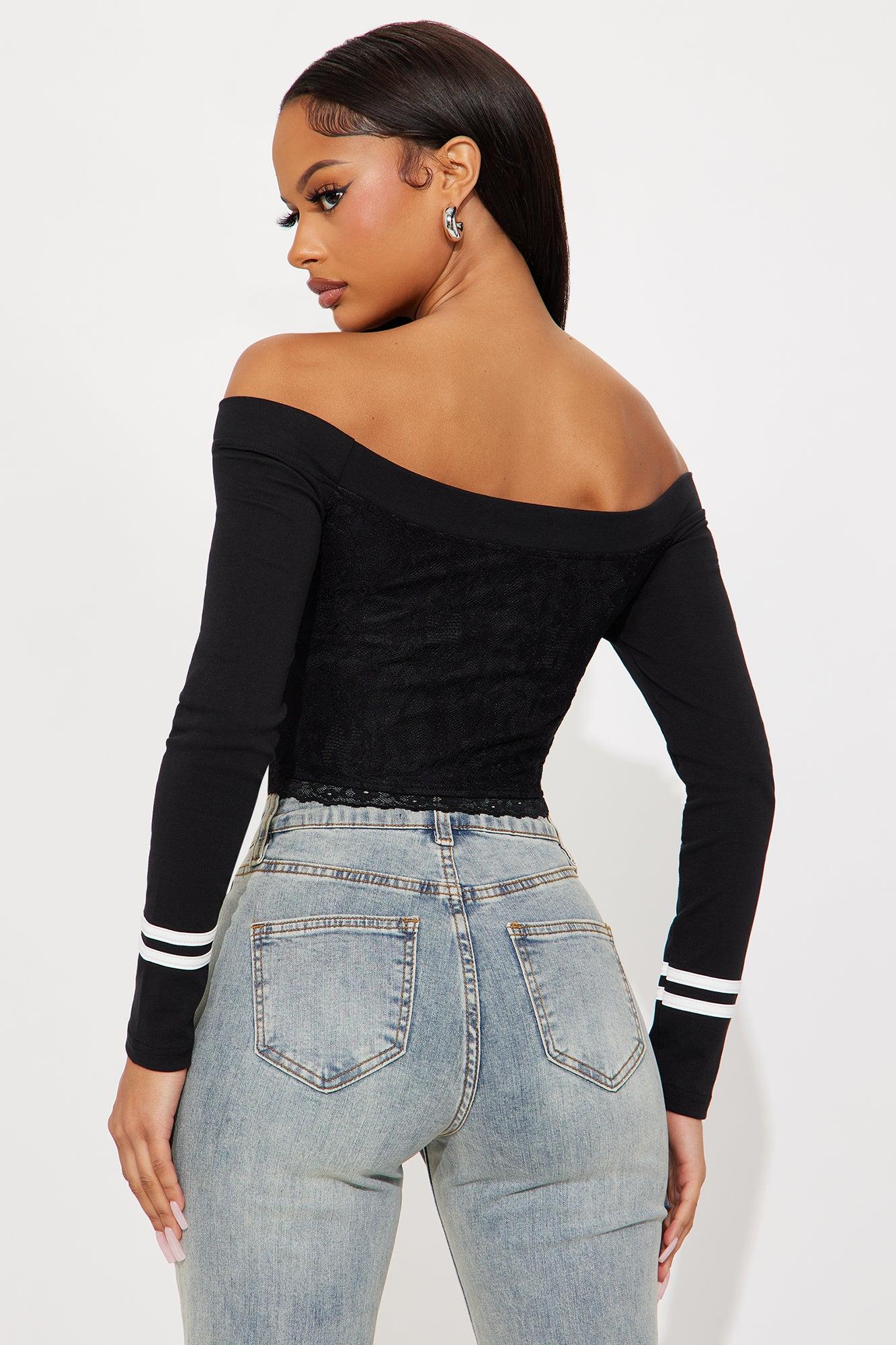 Available In Black And White. Off Shoulder Graphic Long Sleeve Off Shoulder Lace Detail Front Screen Self: 100% Polyamide Contrast: 92% Cotton 8% Spandex Lining: 100% Polyester Imported