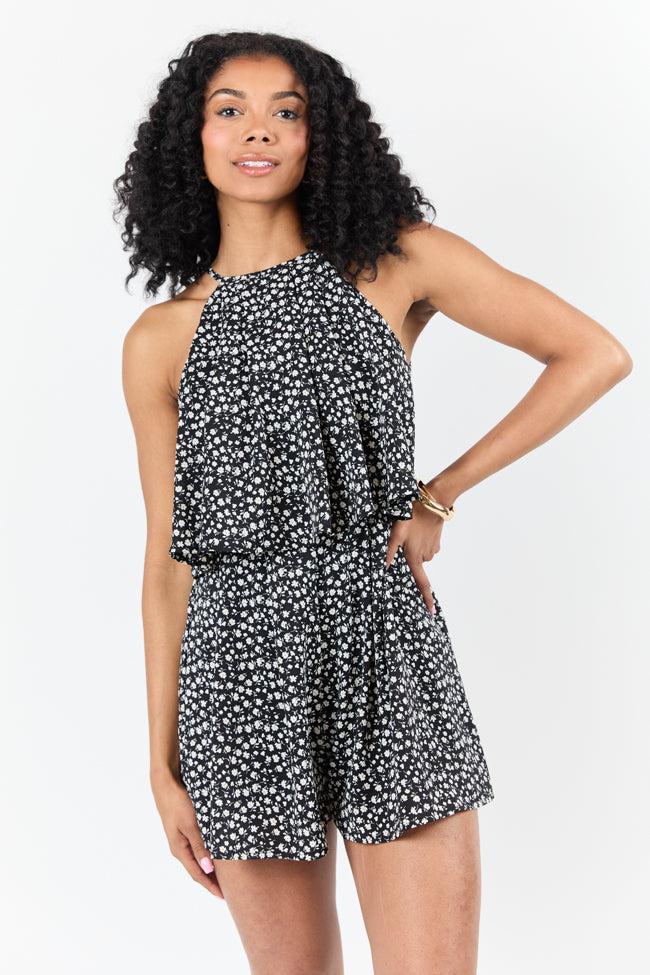Spotlight Moment Black and White Daisy Print Halter Neck Romper DOORBUSTER Product Image