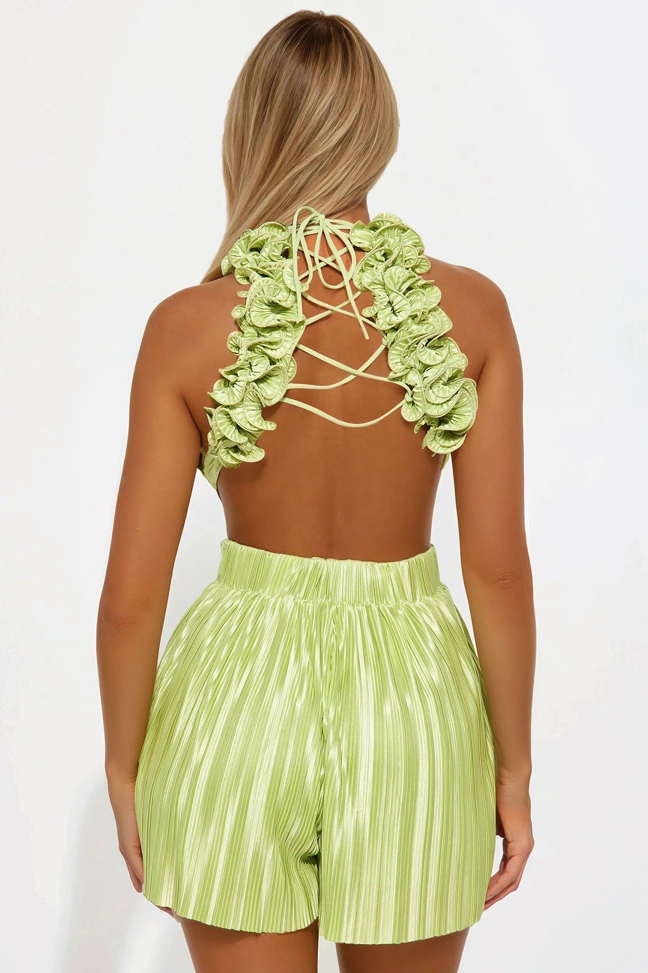 Available In Lime. Romper Back Ruffle Detail Back Lace Up Detail Flowy Short Lined Stretch Self: 100% Polyester Lining: 88% Polyester 12% Spandex Imported