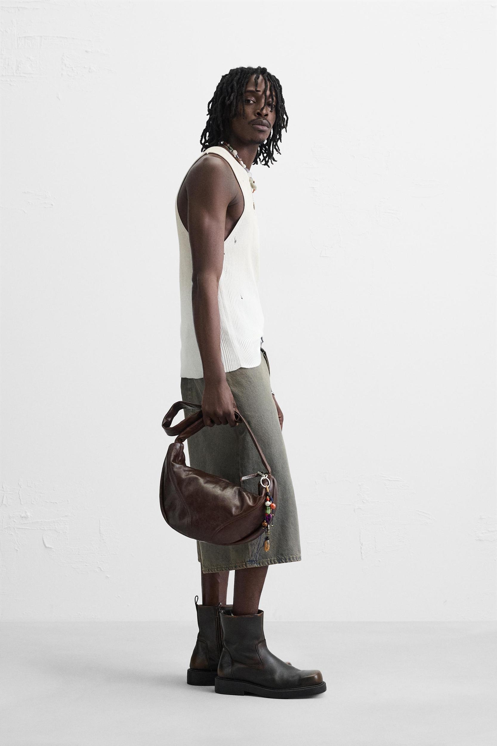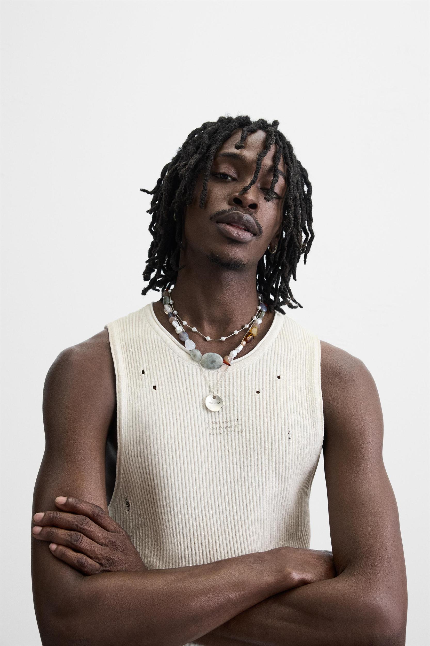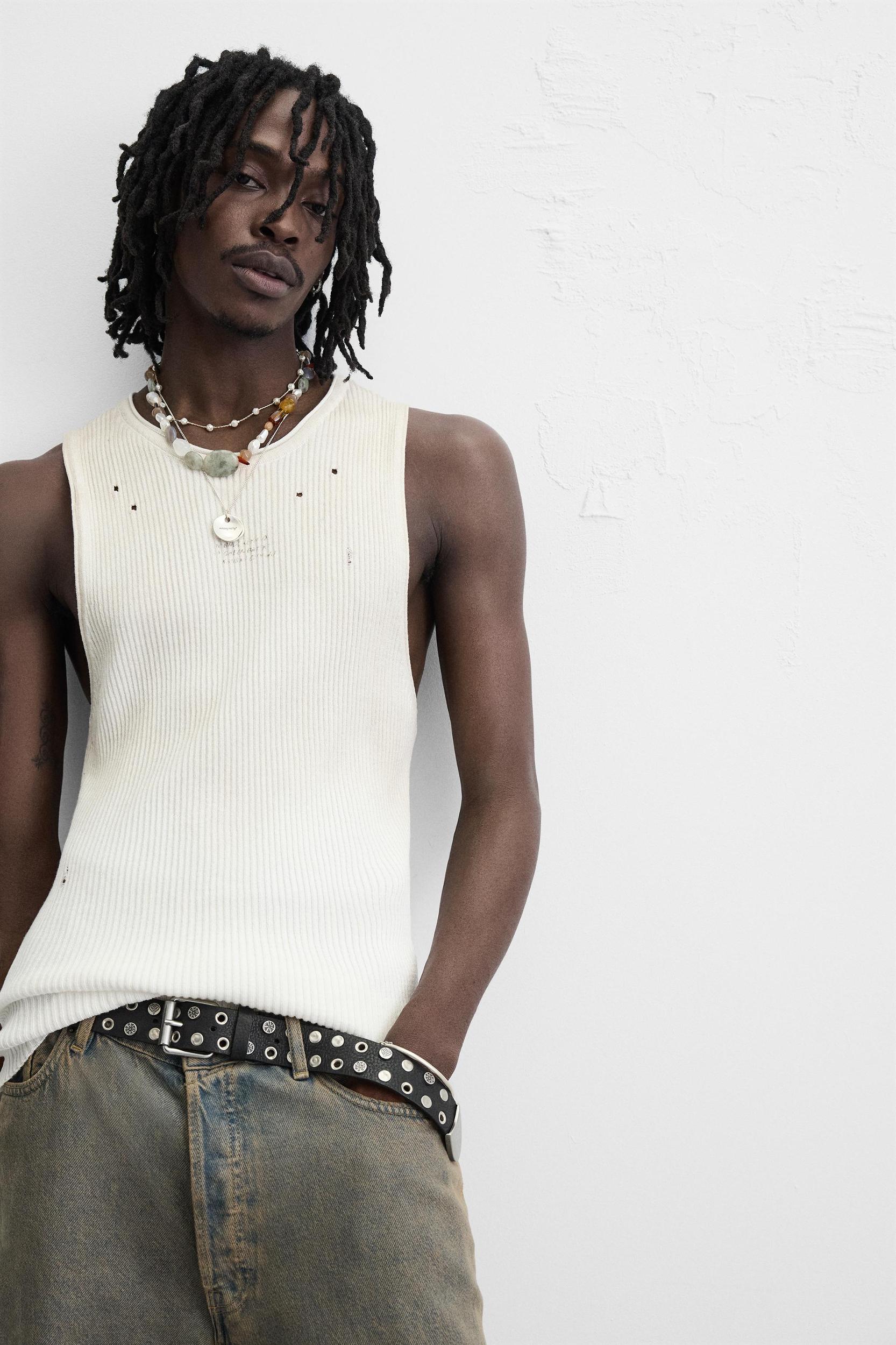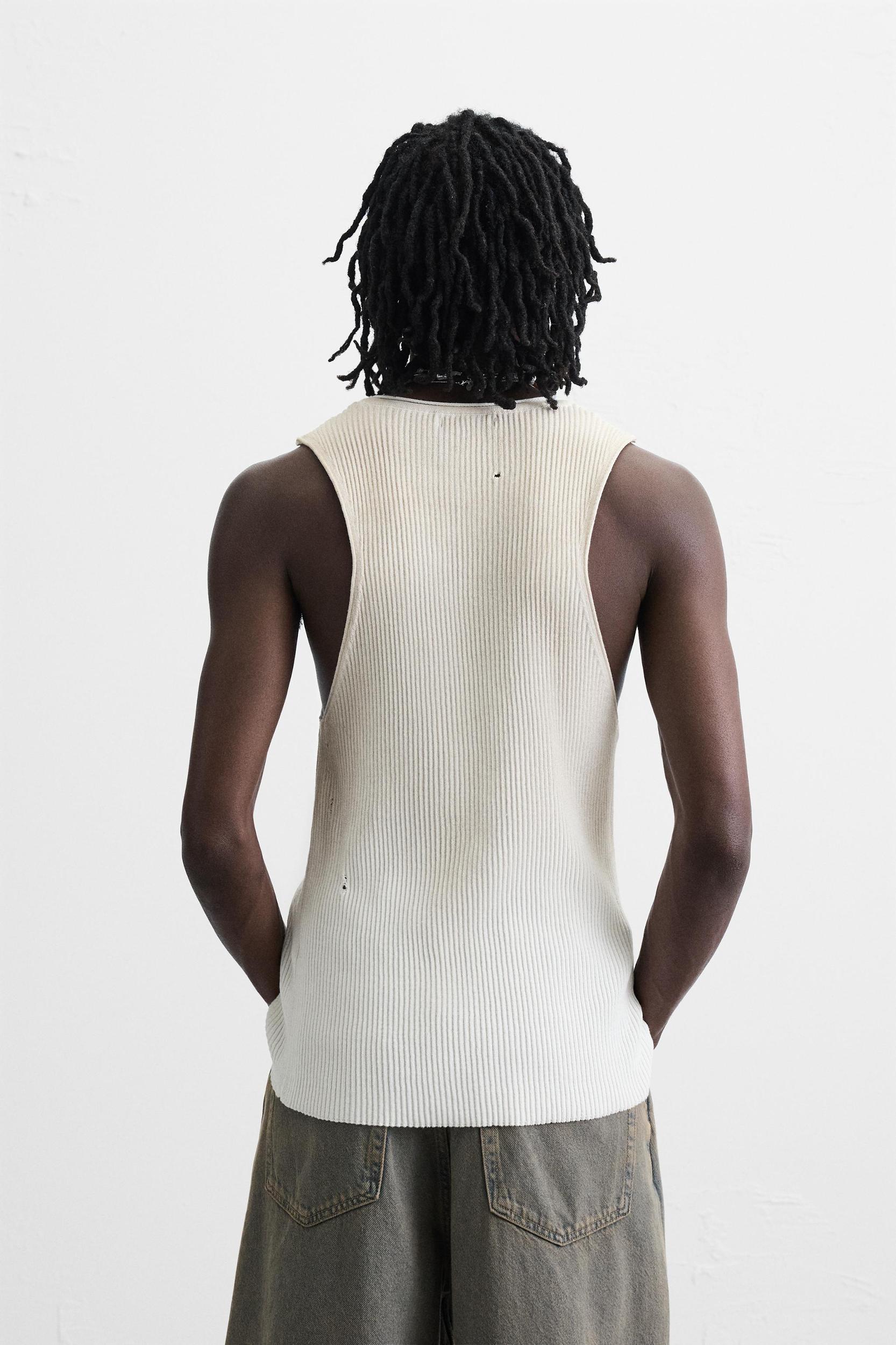 Relaxed fit knit T-shirt made of cotton yarn. Round neck and sleeveless. Spray effect print and rips throughout the garment.