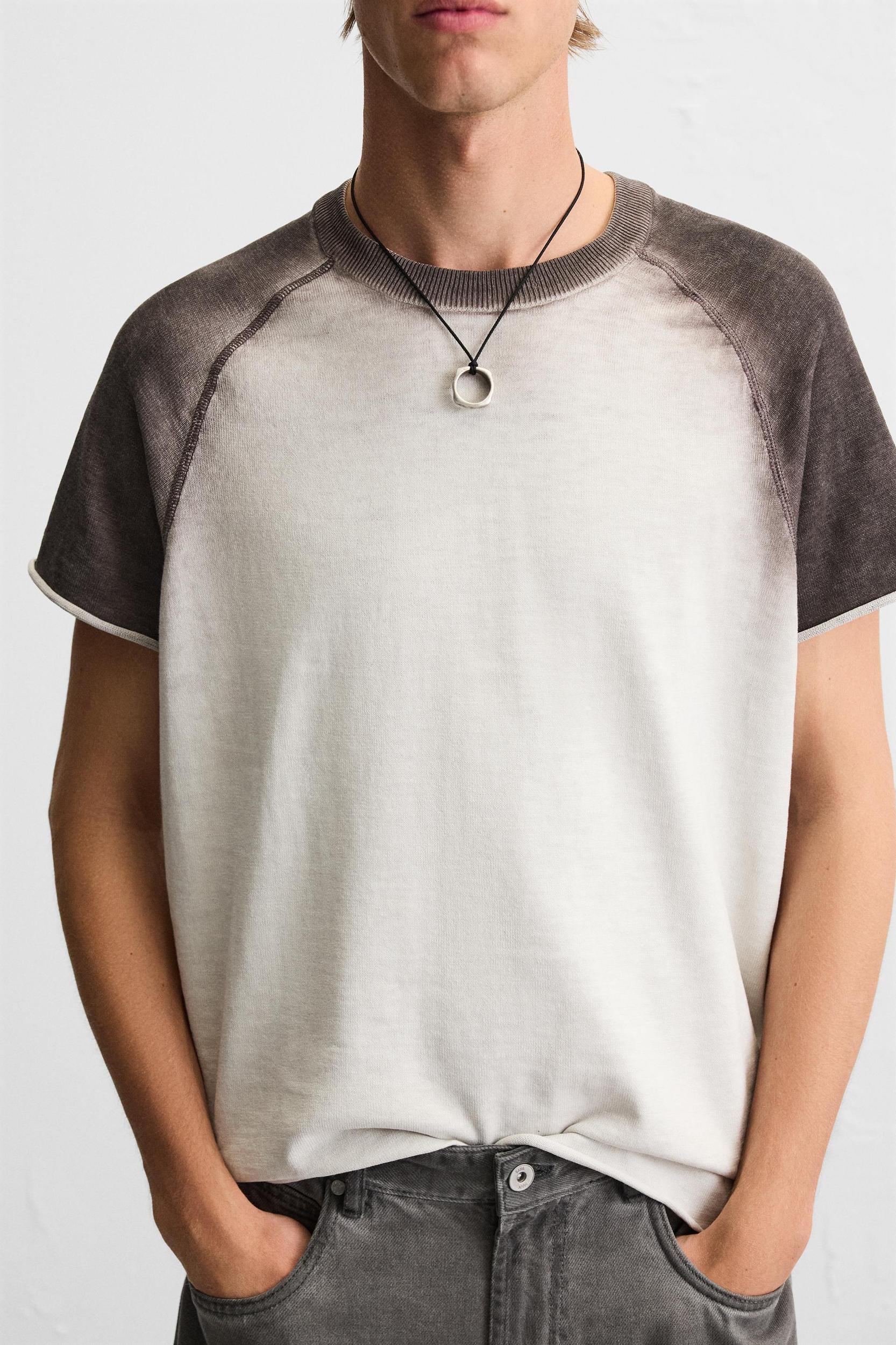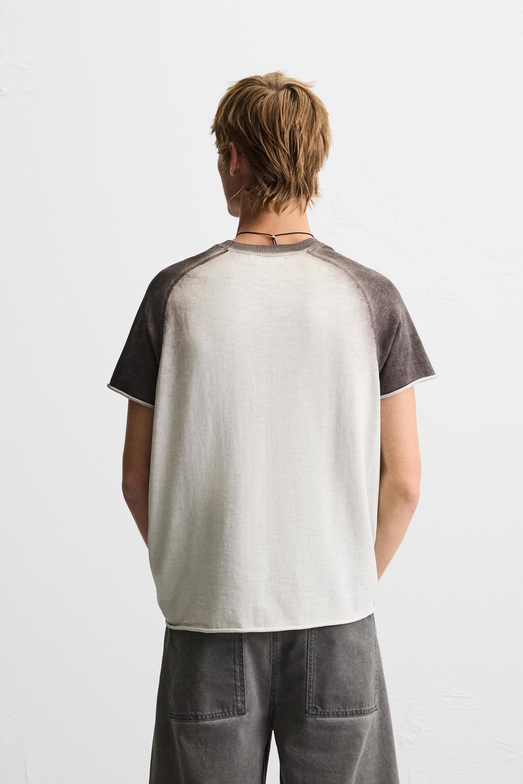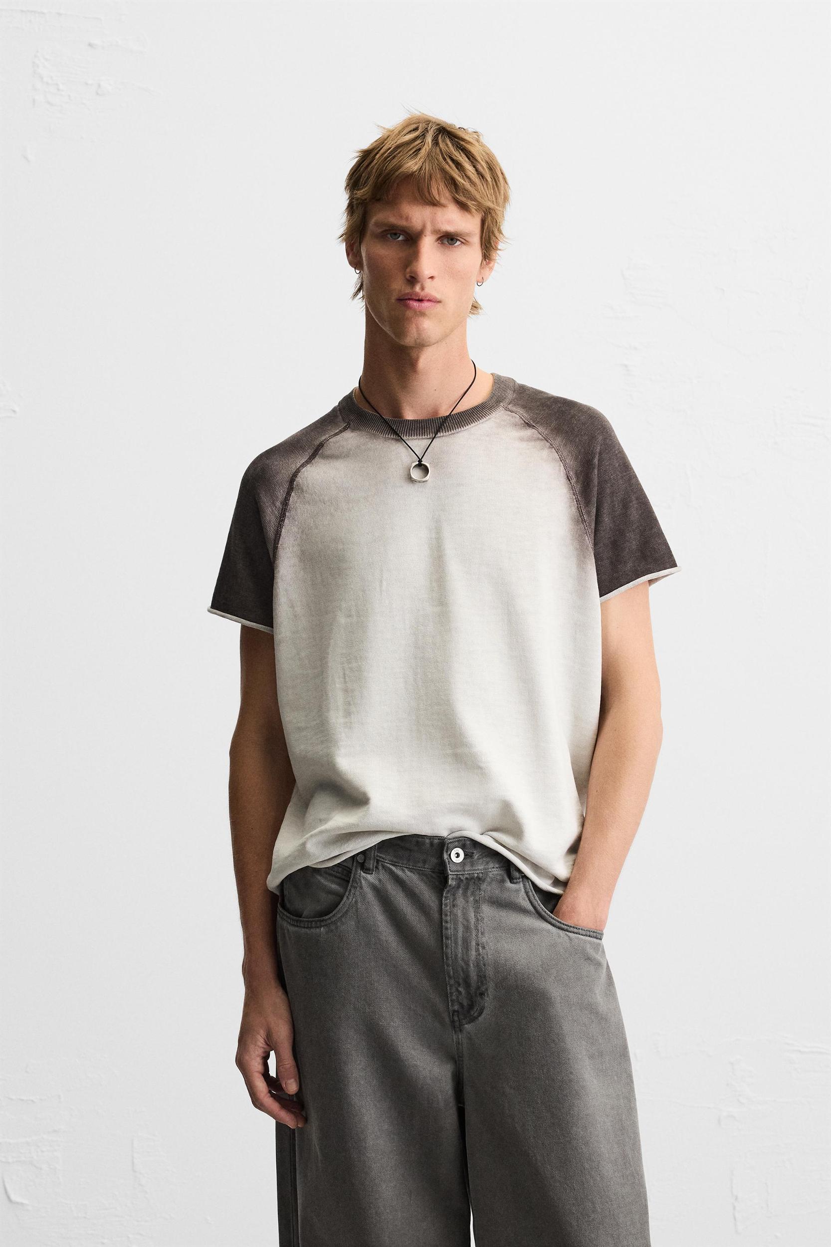 Relaxed fit knit T-shirt in cotton yarn. Round neck and short sleeves. All-over spray effect print. Raw edges.