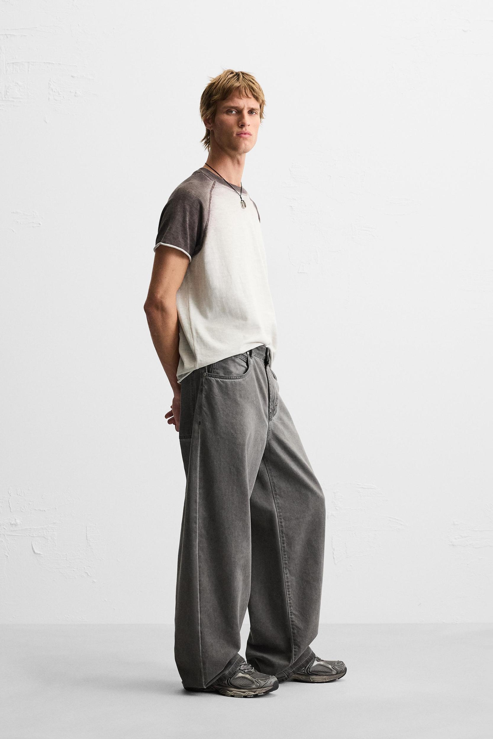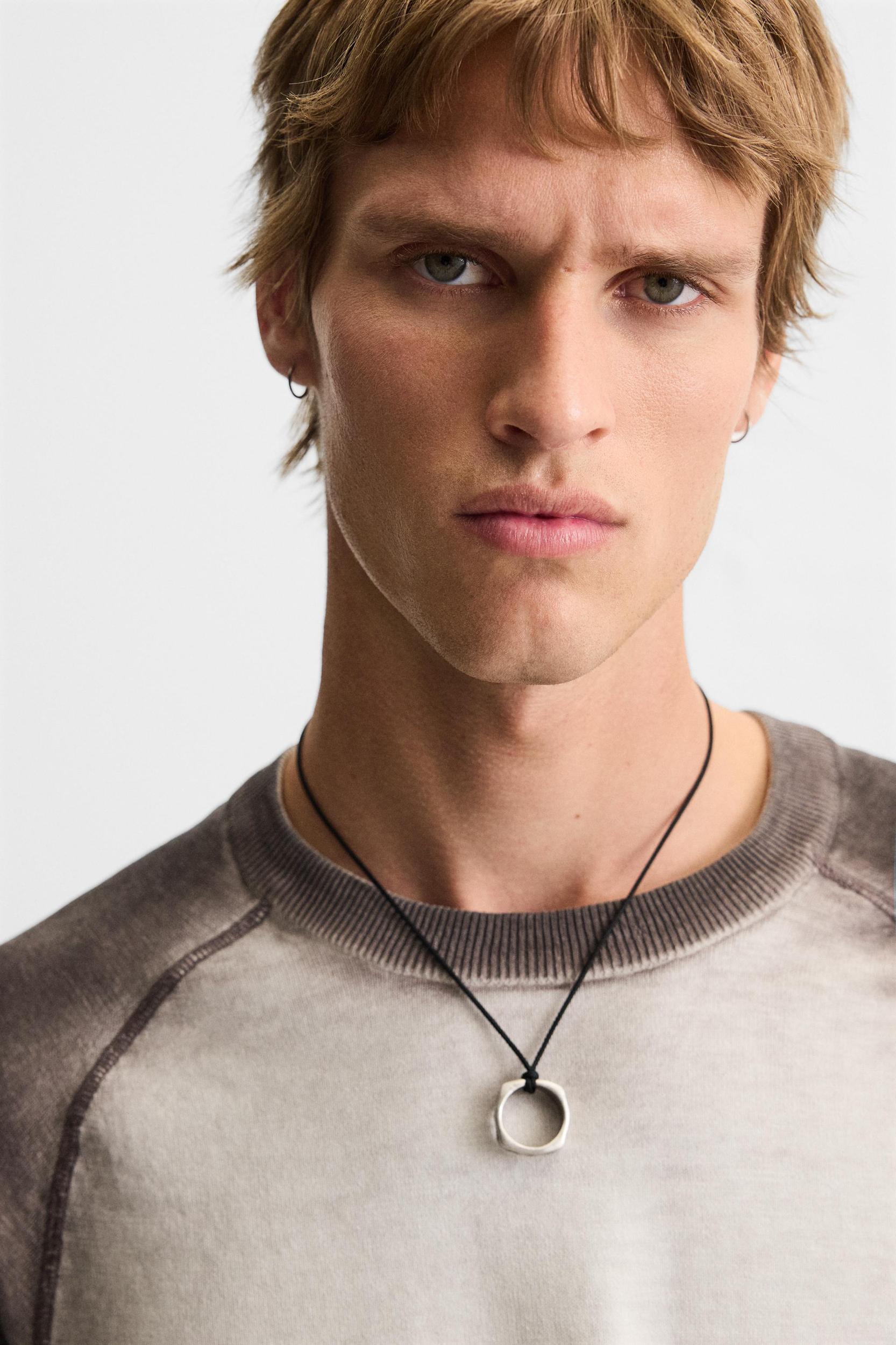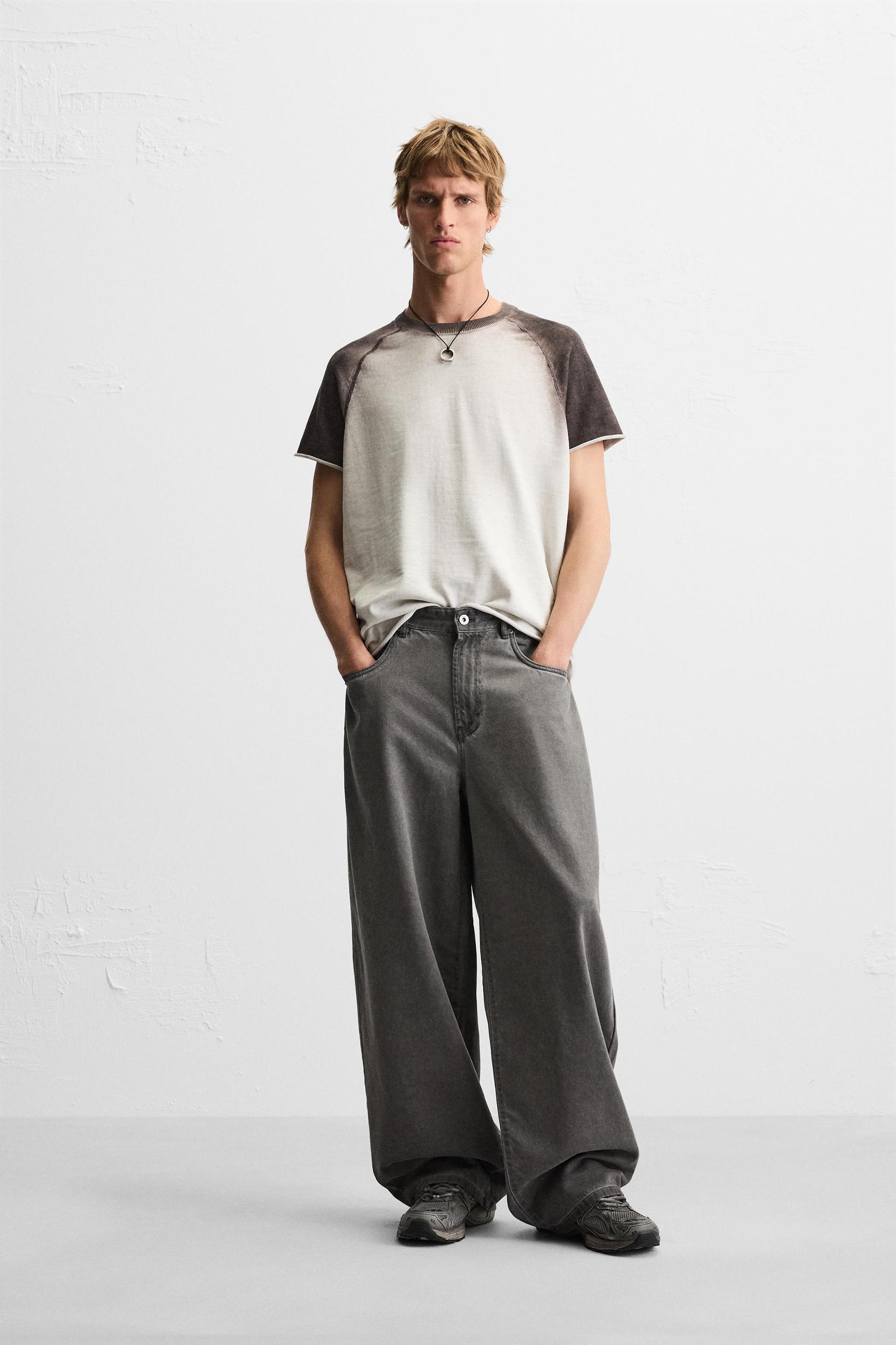 Relaxed fit knit T-shirt in cotton yarn. Round neck and short sleeves. All-over spray effect print. Raw edges.