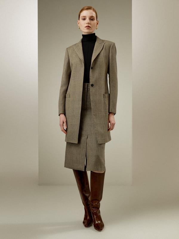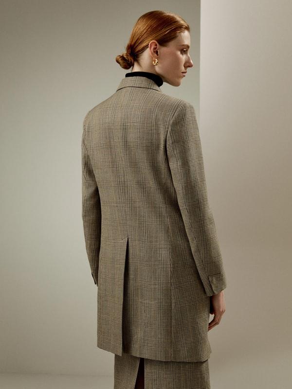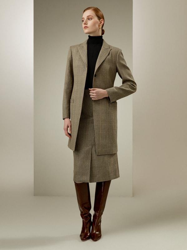 Elevate your wardrobe with our luxurious silk wool blend glen check long blazer, featuring a straight cut design. Perfect for adding a touch of sophistication to your look.