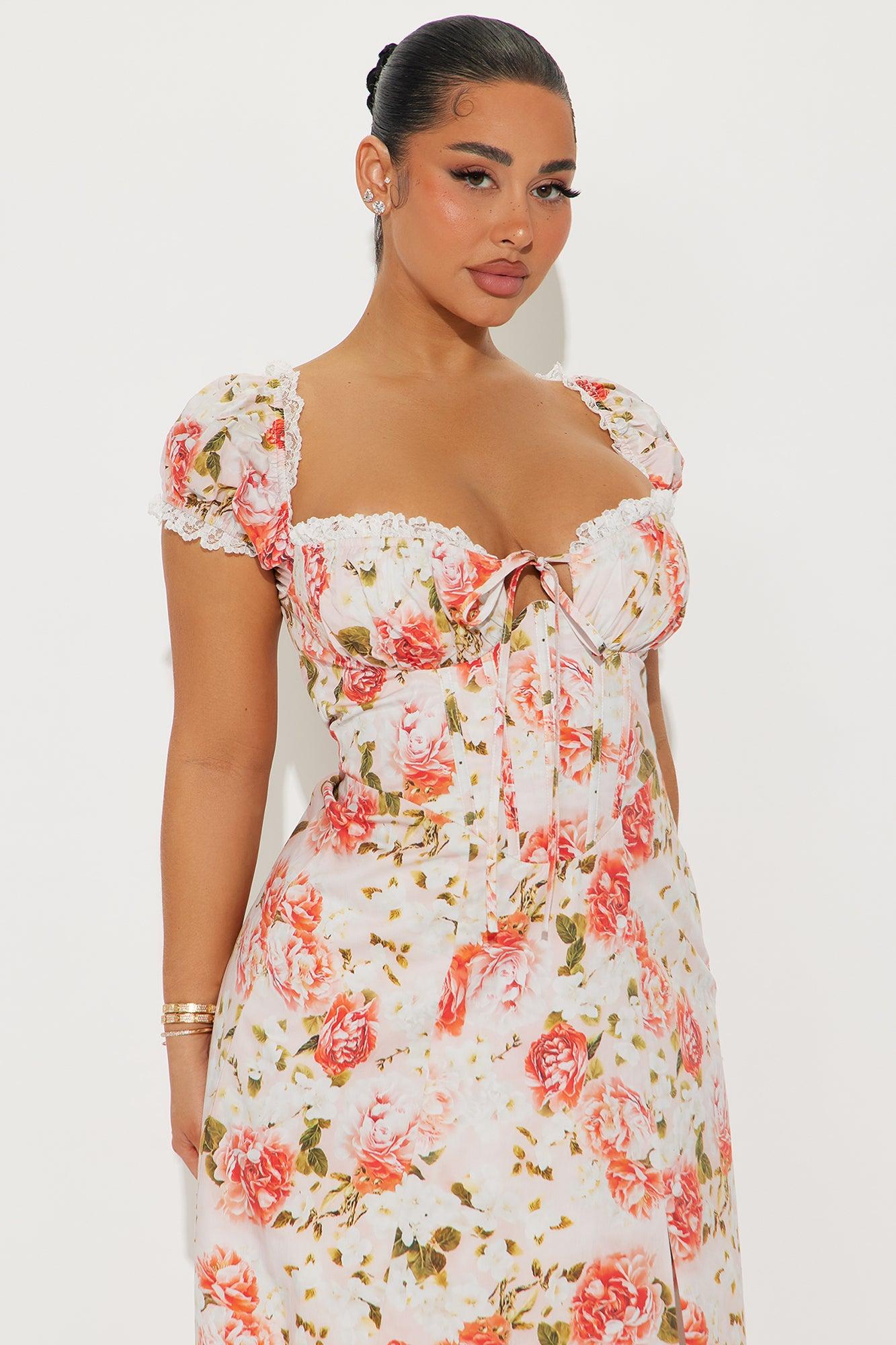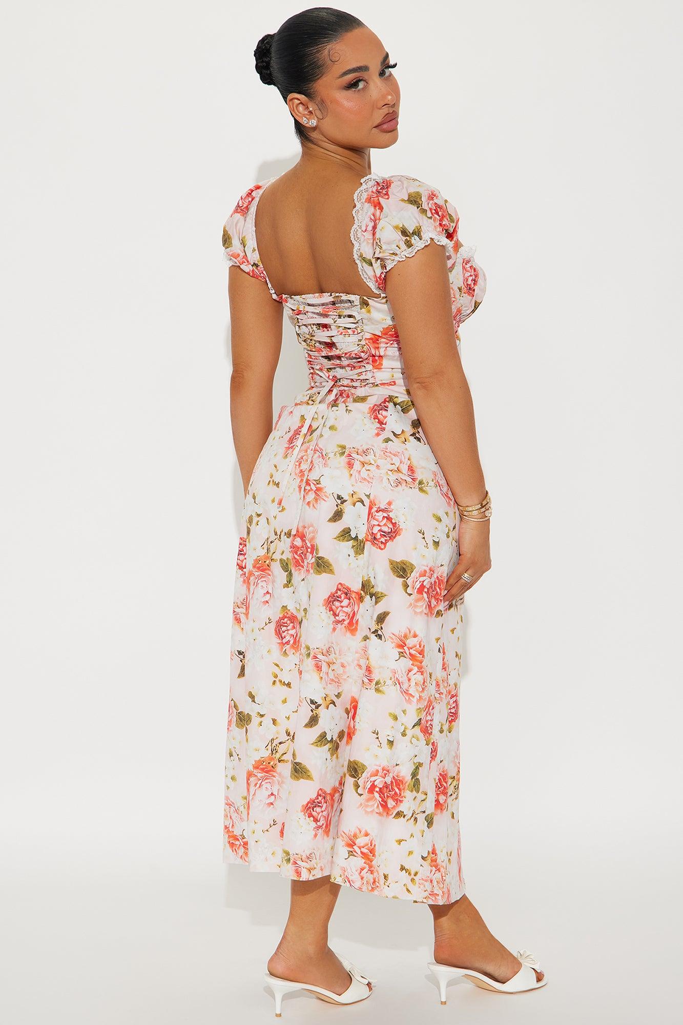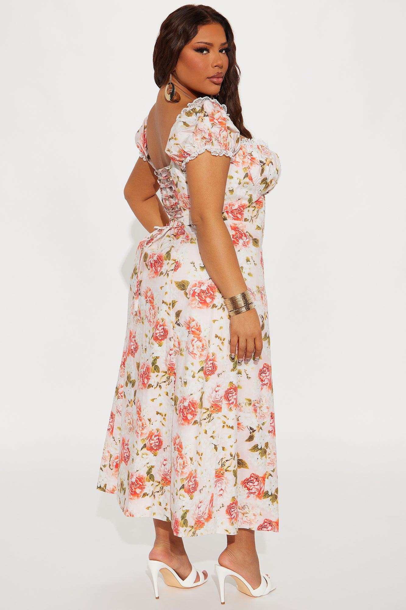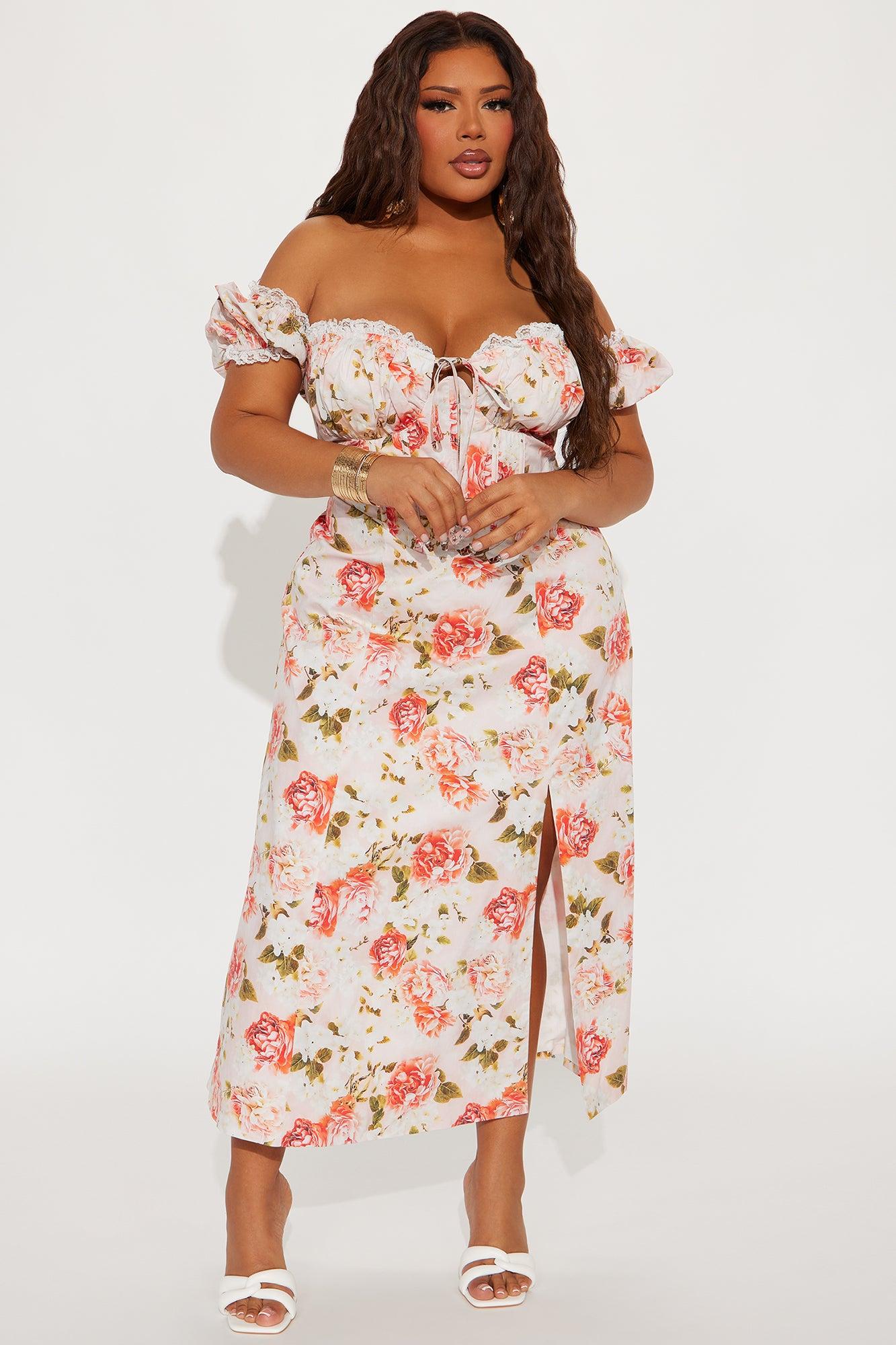 Available In Pink/combo. Off Shoulder Midi Dress Off shoulder Short puff sleeves Lace trim Bra cups Corset waist w/ boning Slit Lace up back Smocked Side zipper Length measured flat = 40" Shell : 100% Cotton Lining : 85% Polyester , 15% Cotton Imported