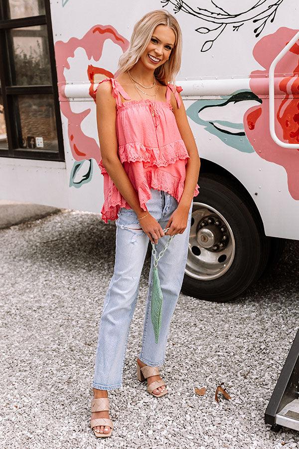 If you have spring fever, then this darling pink top is perfect for you! This cutie features lightweight breezy material with ruffled detailing, a square neckline with tie shoulder spaghetti straps, and an ultra relaxed tiered silhouette that falls into an uneven hemline! Measurements S : Bust 26-30", Hip 42", Length 25", Waist 34". M : Bust 28-32", Hip 44", Length 25.5", Waist 36". L : Bust 30-34", Hip 46", Length 26", Waist 38".