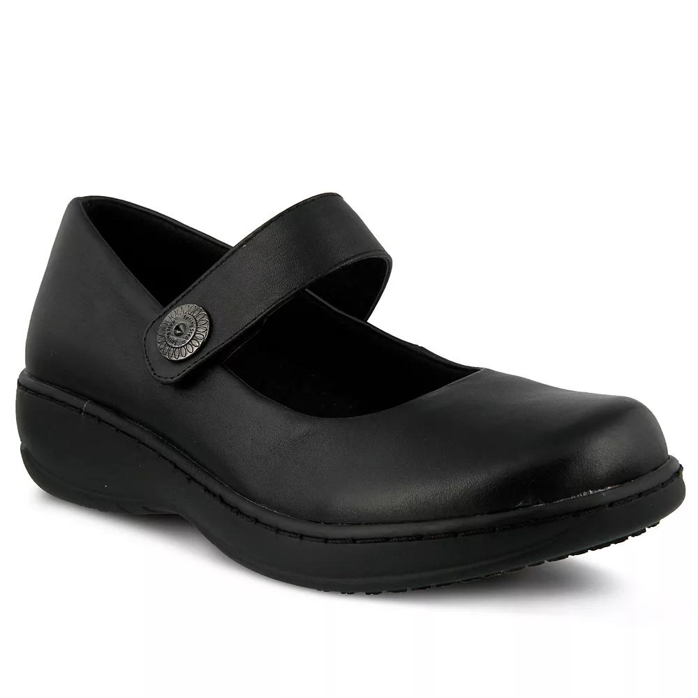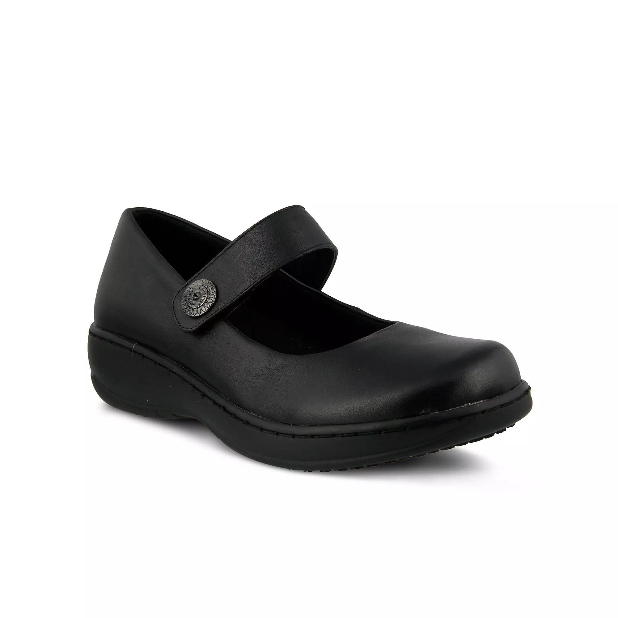 Casual style is effortless wit hthese Wisteria mary-janes from Spring Step.SHOE FEATURES Ornate metal button SHOE CONSTRUCTION Leather upper Textile lining Manmade outsole SHOE DETAILS Round toe Hook & loop closureiPadded footbed 1.5-in. heel Size: 9.5 Wide. Color: Black. Gender: female. Age Group: adult.