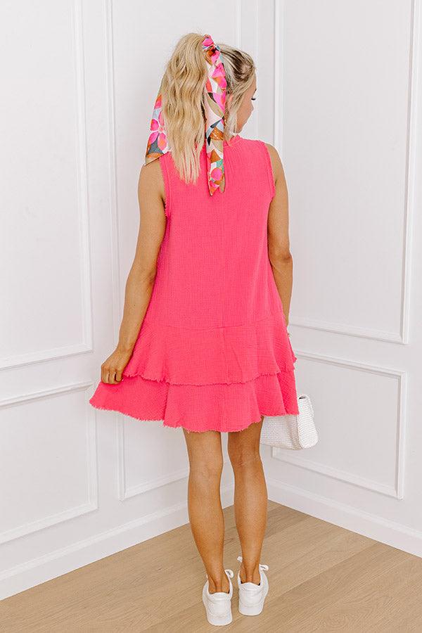 - Walk to town square in style with this trendy dress! - Unlined subtly textured material with frayed accents - Crew cut neckline with back button closure and a keyhole detail - A sleeveless cut - Hidden side pockets - Frayed tiers - A relaxed silhouette that ends in a frayed hemline