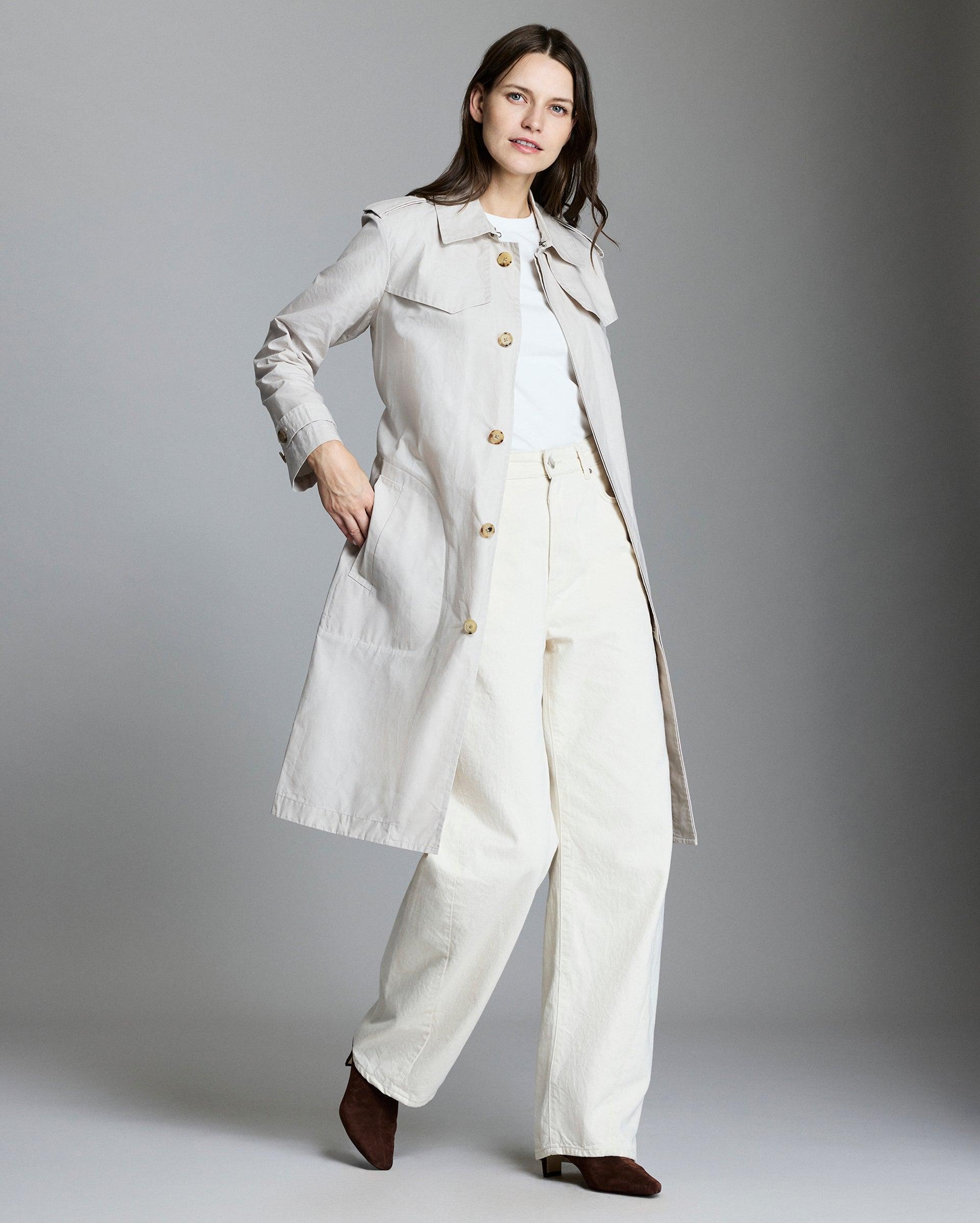 A trench coat goes with everything. This sophisticated, timeless style is ready to elevate any wardrobe choice. It’s not double breasted, so the closure is relaxed and loose to pull on over a jacket or simple tee and jeans. Our take on the classic coat also skips the dramatic lapel and instead offers a storm flap with