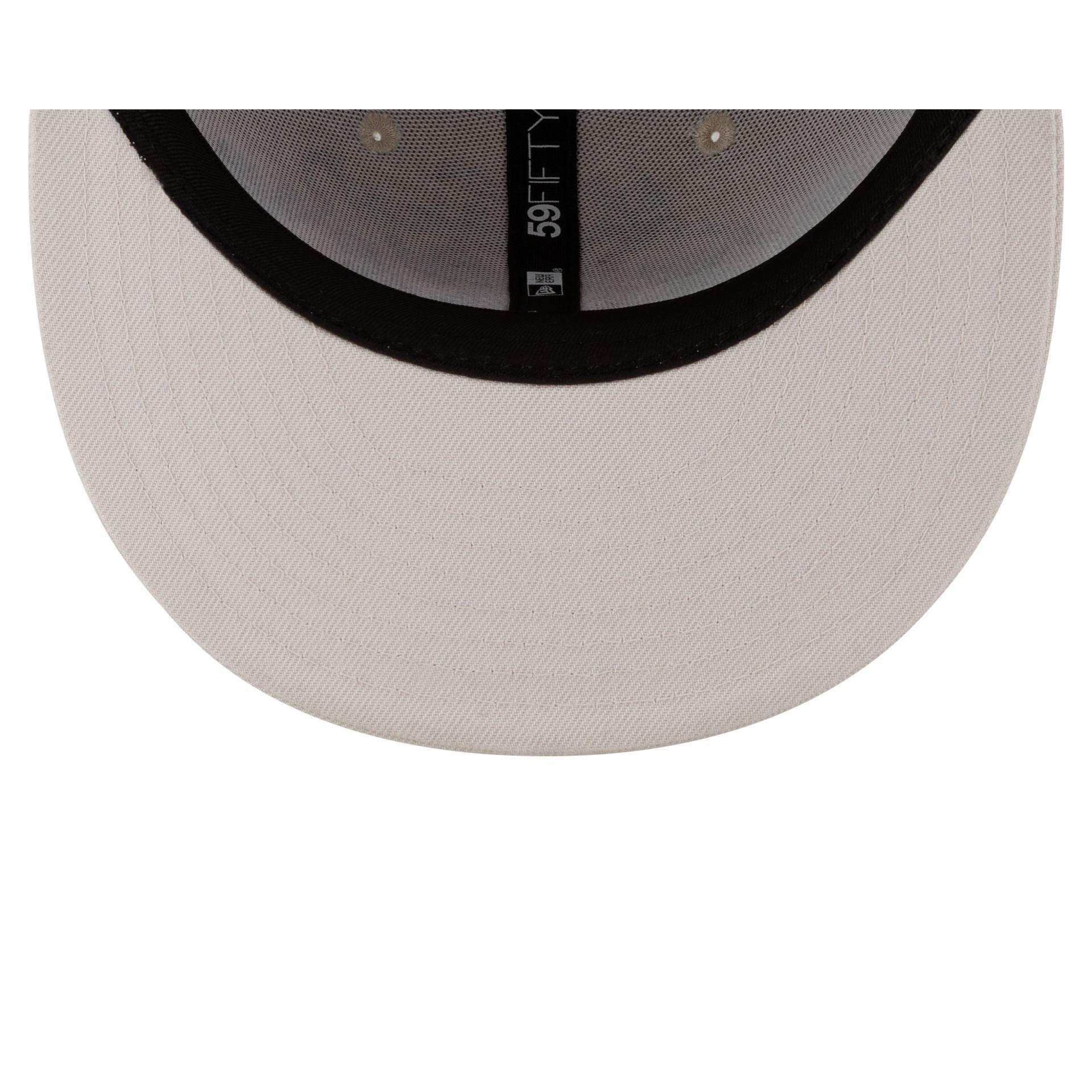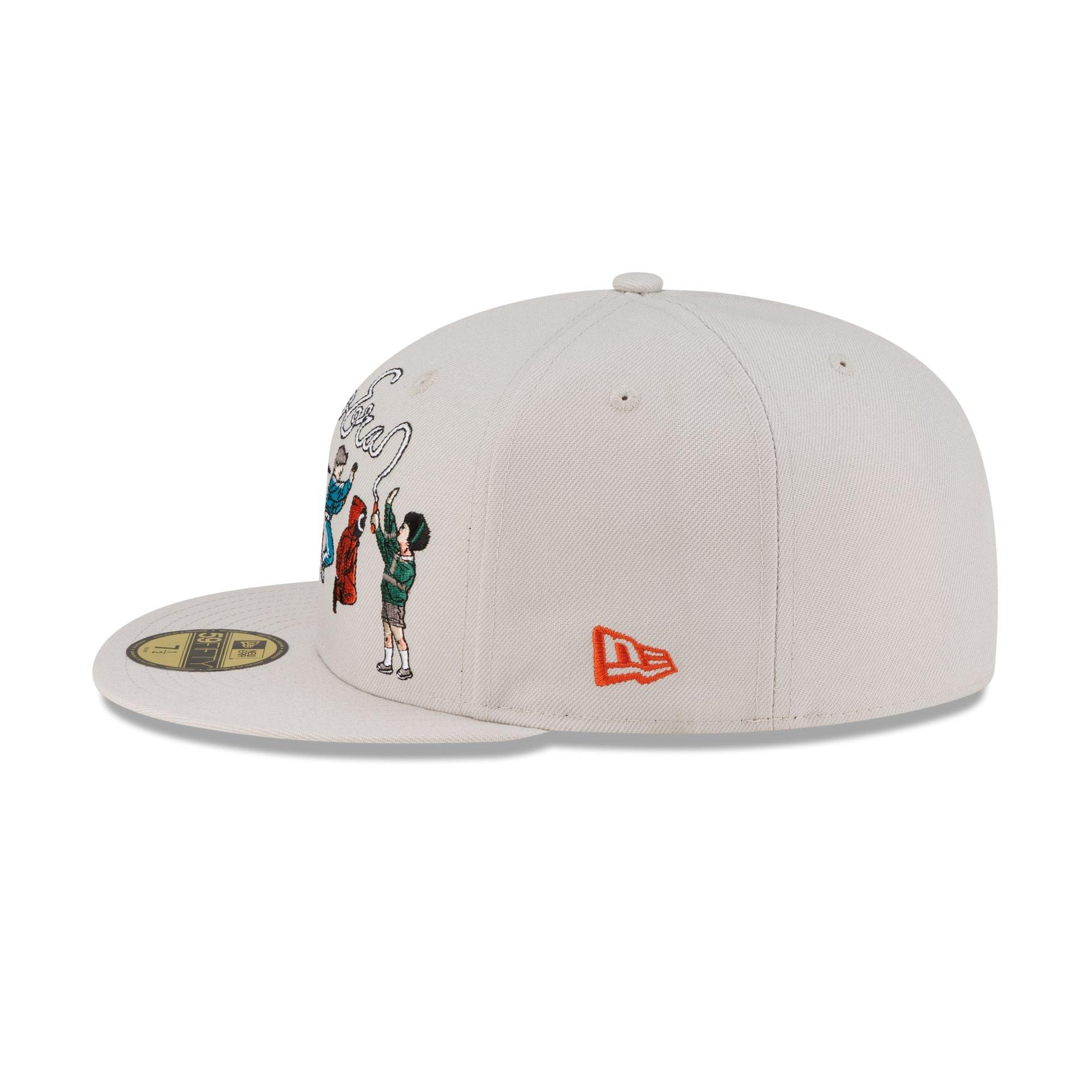 The Squid Game Stone 59FIFTY Fitted Cap features an embroidered Squid Game New Era Script and Squid Game characters at the front panels with a logo at the rear. Additional details include yellow butterflies at the right-wear side and a stone undervisor.