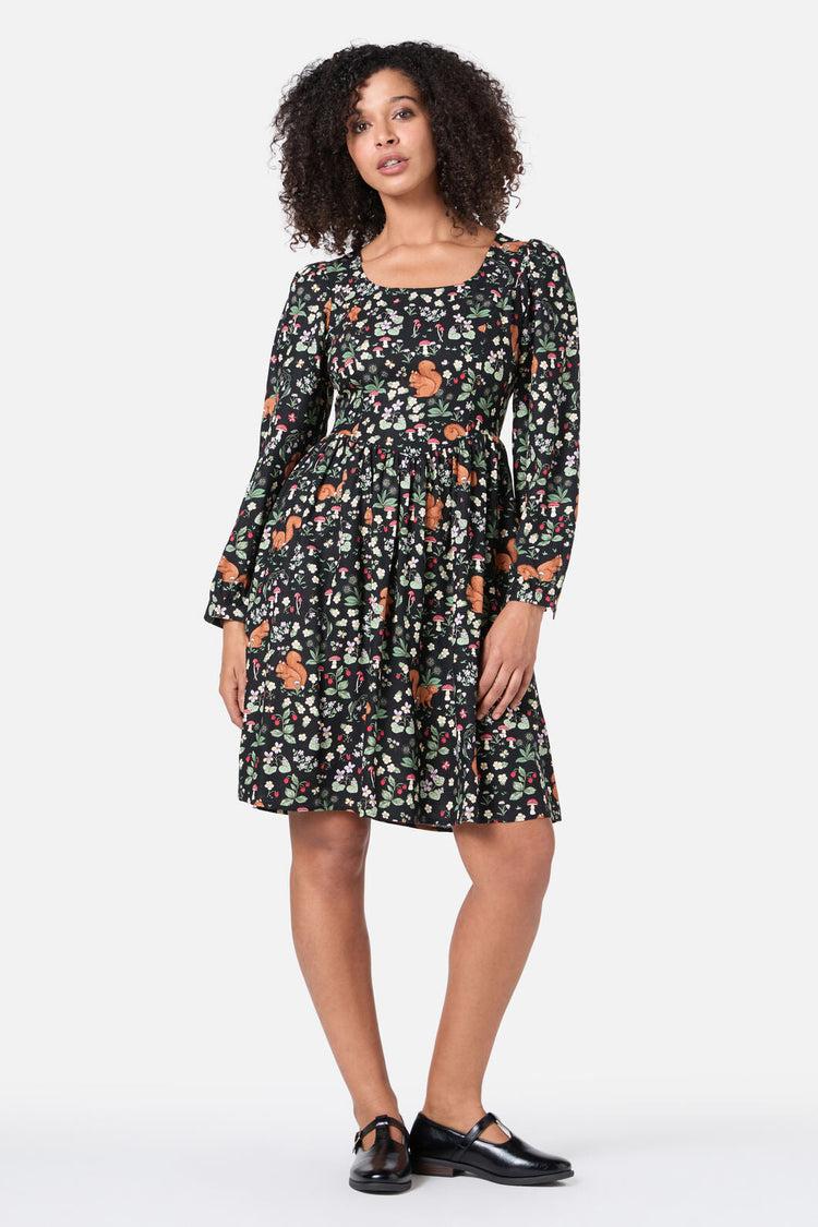 The Squirrel Away Mini Dress by Princess Highway captures the magic of the forest in a flattering silhouette. This black long sleeve mini dress features a charming print of squirrels, forest flowers, and mushrooms, set against a corset-shaped bodice that hugs in all the right places.Designed with princess seams, a scoop neckline, full-length sleeves with button cuffs, and a gathered skirt that finishes just above the knee. The adjustable back tie lets you customize your shape, while the linen-viscose blend keeps things breathable and soft.Fabric55% Linen 45% ViscoseCare InstructionsCold delicate machine washWash garment inside outWash with like coloursDo not wring or spinDo not bleach or soakDo not tumble dryLine dry in shadeWarm iron on reverse if required