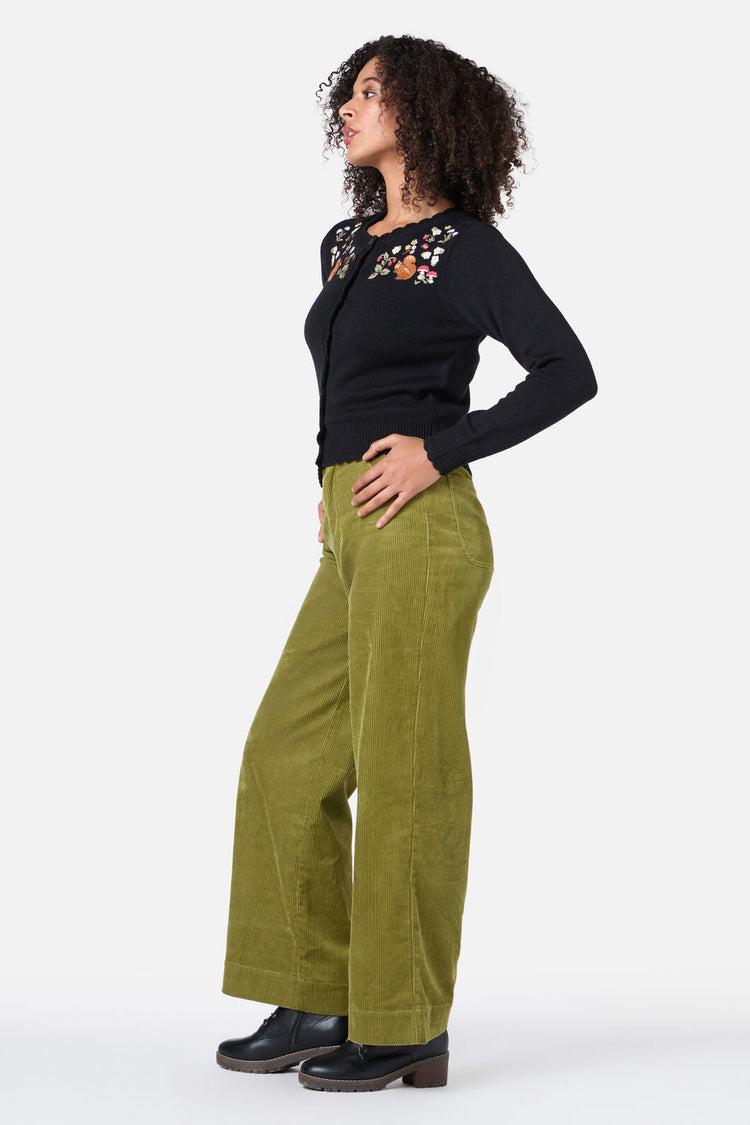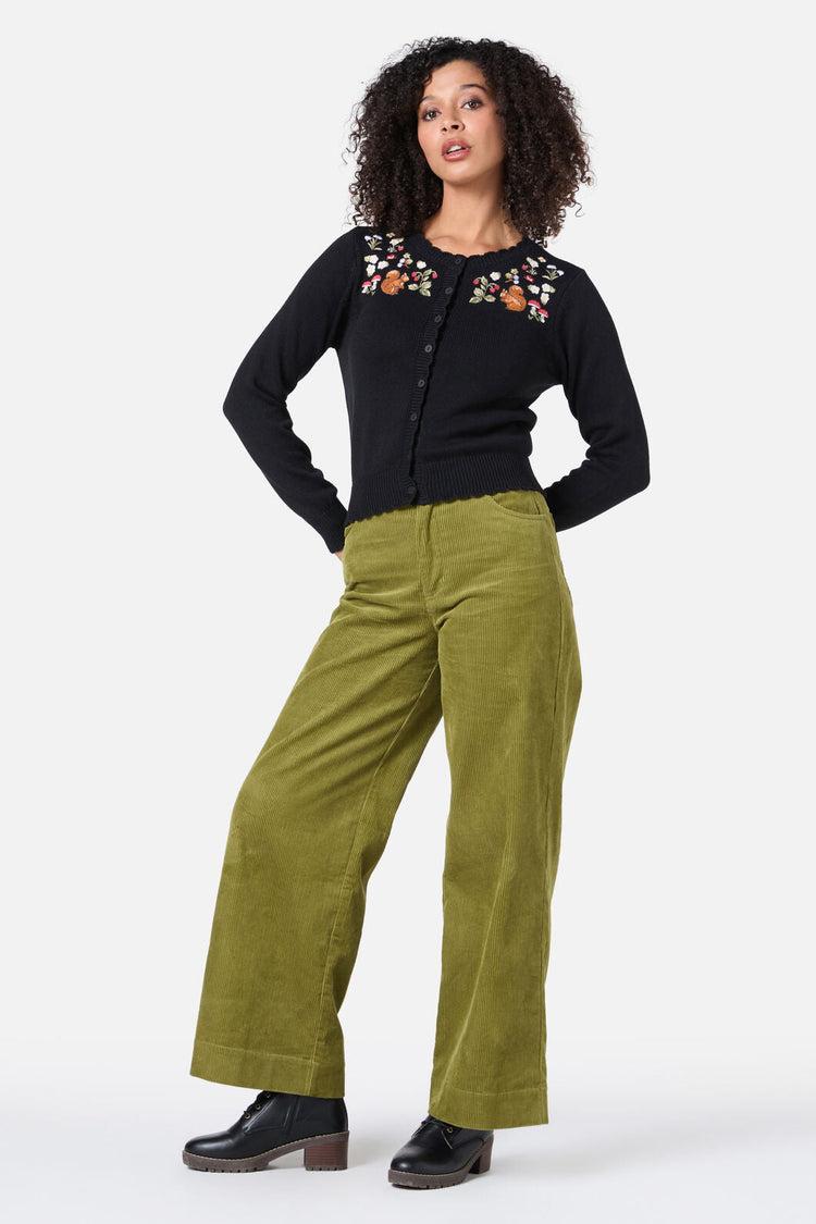 Add a touch of woodland magic to your layering with the Princess Highway Squirrel Embroidered Cardigan. This cozy knit features delightful embroidered squirrels, forest flowers, and mushrooms scattered across a classic black backdrop. A semi-fitted silhouette with a high round neckline and ribbed trims makes it perfect for pairing with dresses or high-waisted skirts.High round necklineFull-length sleevesButton-down frontRibbed hem, neckline, and cuffsSemi-fitted knit styleEmbroidered woodland detailsSoft cotton-acrylic blendAvailable in blackFabric & Care55% Acrylic, 45% CottonGentle cold hand washWash garment inside out with like coloursDo not wring or spinDo not bleach or soakDo not tumble dryPull into shape and dry flat in shadeCool iron on reverse if requiredDo not dry clean