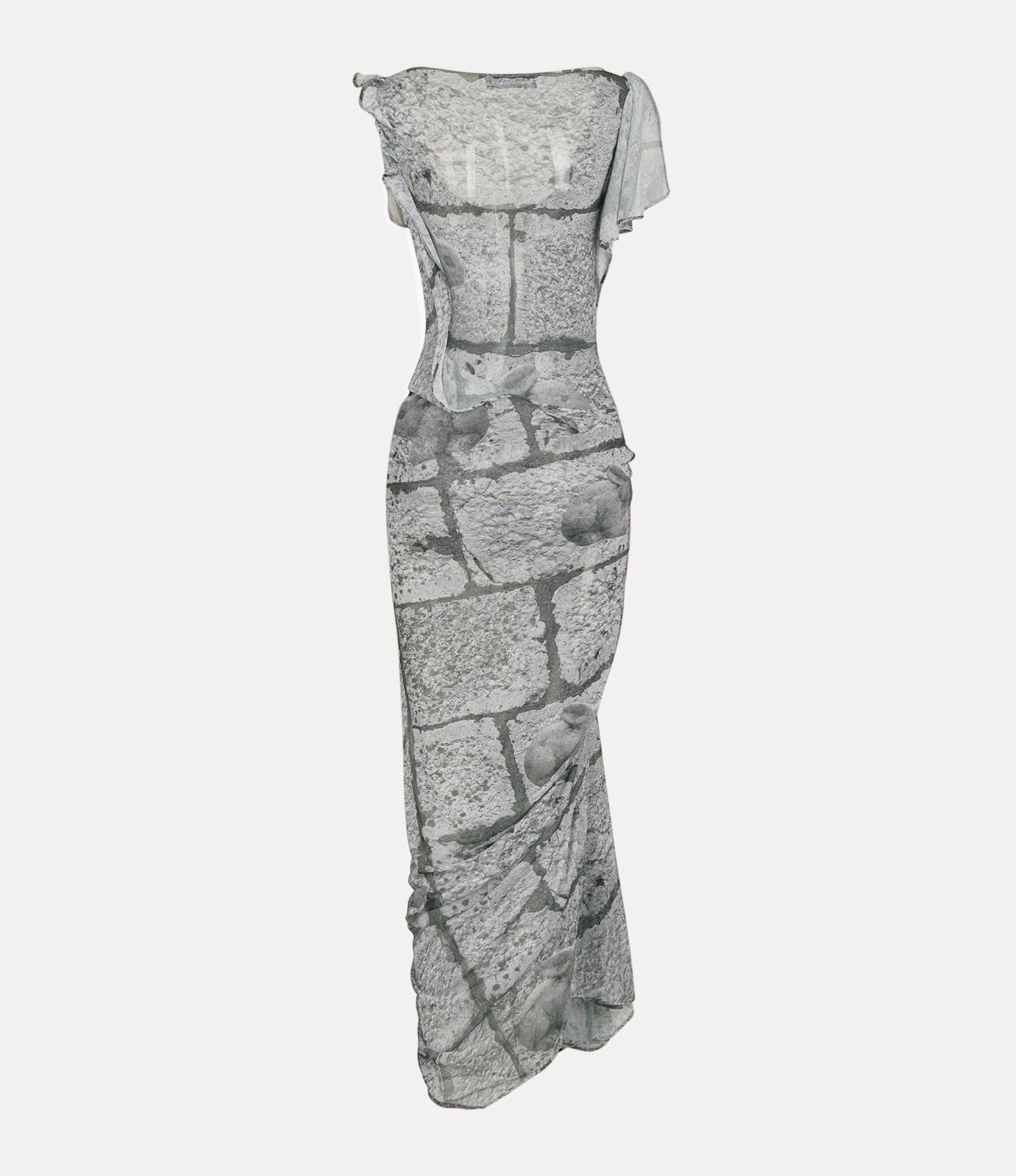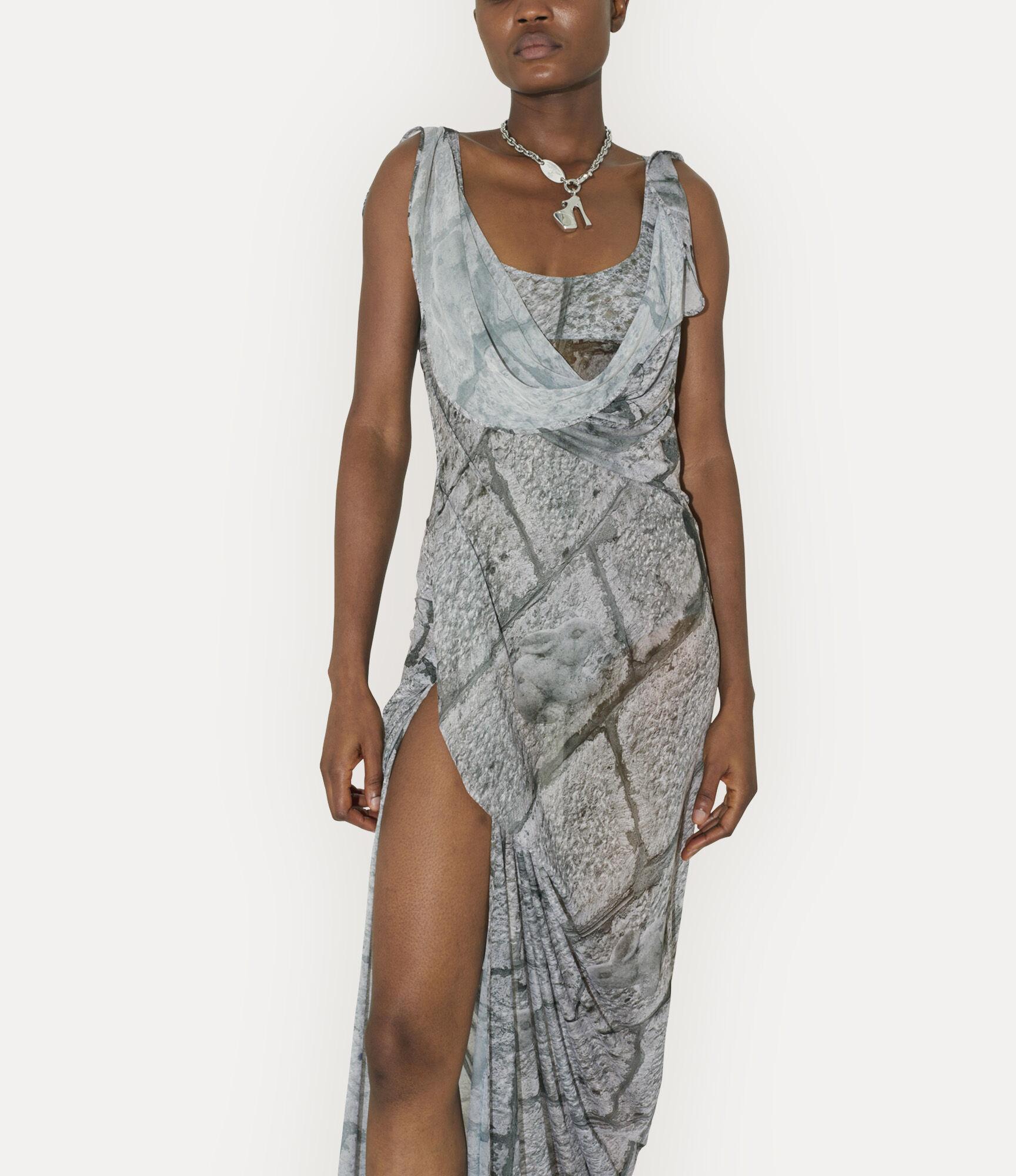 Our SS Long Graffiti dress features rabbit trinkets printed in monochromatic halftone, overlaid on a brick wall backdrop to form an abstract, textured pattern. The piece offers delicate drapery at the neckline, flowing into an asymmetric hemline, finished with a side-slit detail.