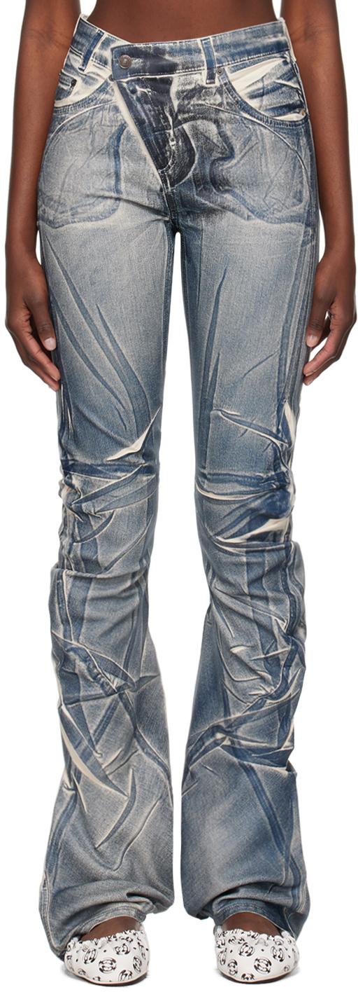 Handcrafted stretch denim jeans. Trompe l'œil graphic printed throughout.