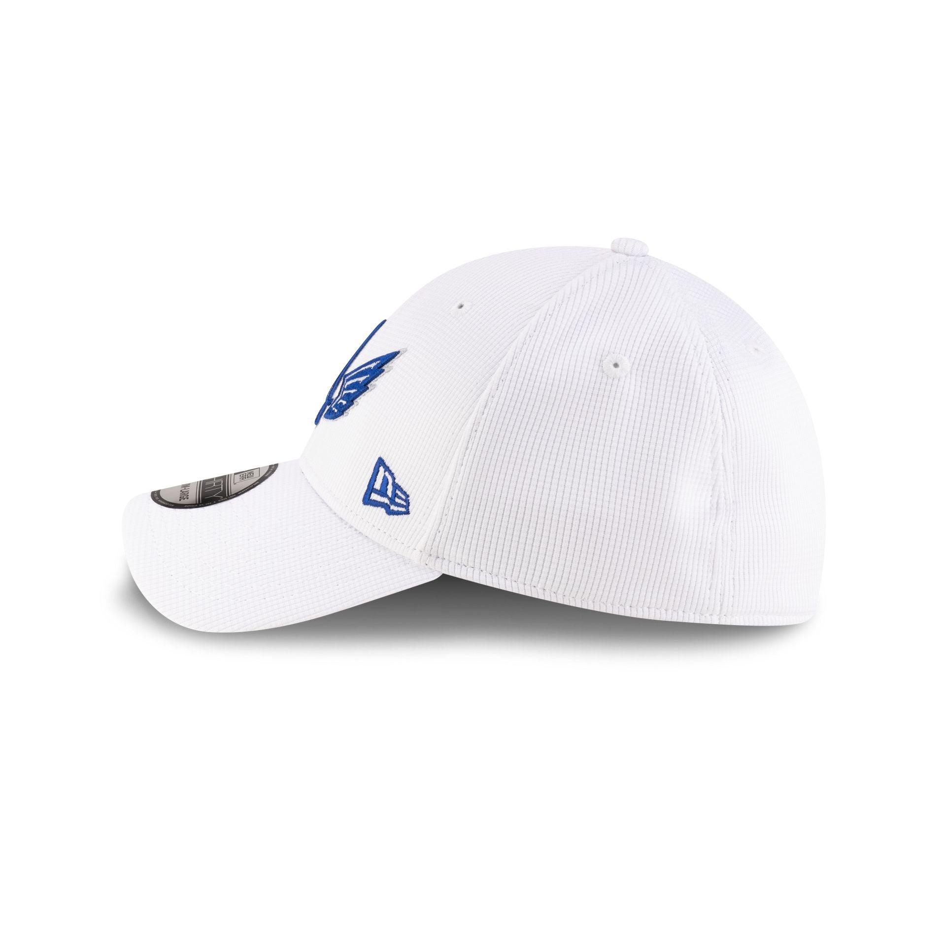 The St. Louis Battlehawks White 39THIRTY Stretch Fit Cap features an embroidered Battlehawks logo at the front panels with the New Era Flag at the left. Additional details include a UFL logo at the rear and a gray undervisor.