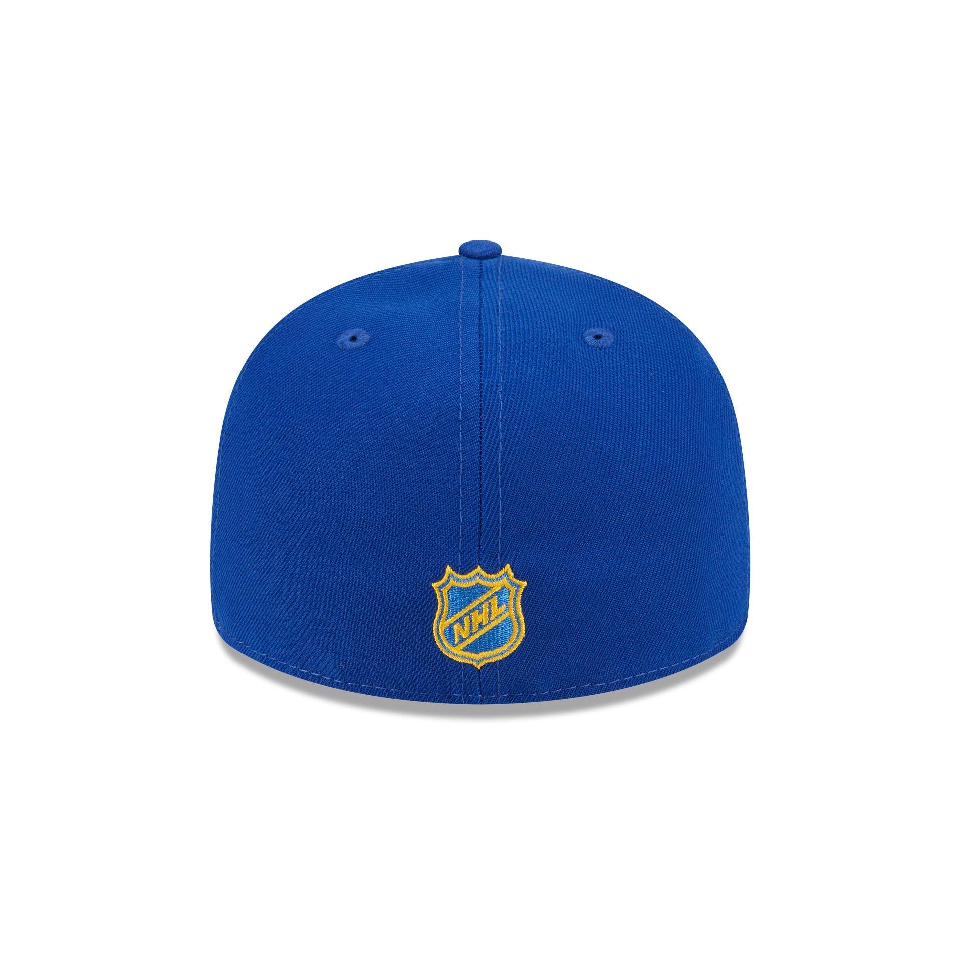 The St. Louis Blues NHL Pack Low Profile 59FIFTY Fitted Cap features an embroidered Blues wordmark over a team logo at the front panels with a matching NHL Shield at the rear. Additional details include a team logo at the right-wear side with a green undervisor.