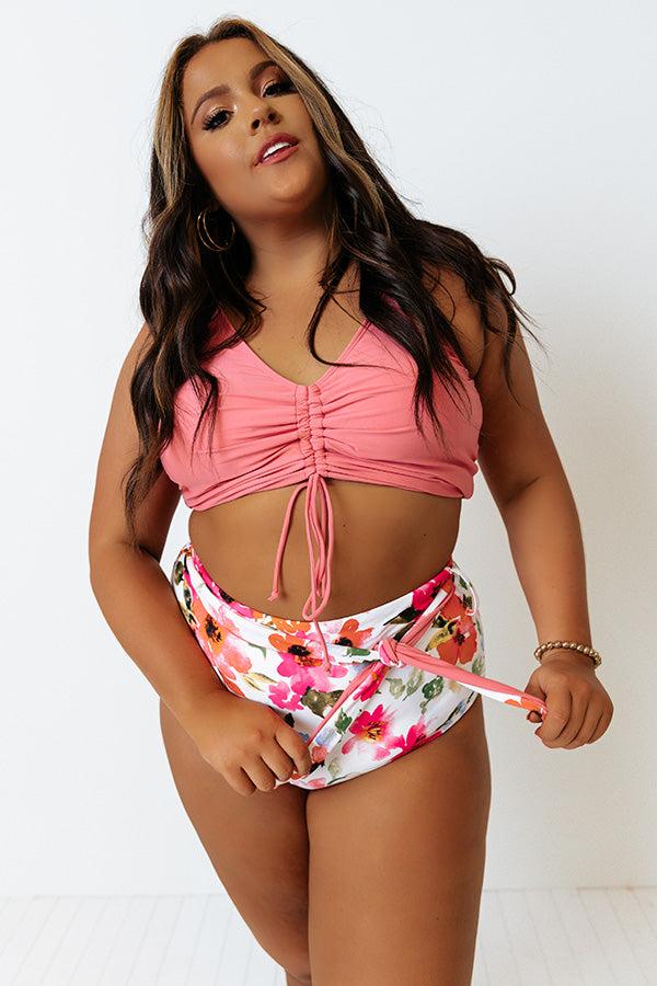 Strut into summer with confidence in our adorable plus size 'St. Thomas Treat' reversible bikini bottoms featuring lightweight four-way stretch material patterned with a pink and green floral print on one side and solid pink on the other, a high waistline with belt loops and a tie belt for tummy control, and a flattering form fitting silhouette that ends in a cheeky fit! Measurements XL : Hip 42-46", Waist 32-36". 2XL : Hip 44-48", Waist 34-38". 3XL : Hip 46-50", Waist 36-40".