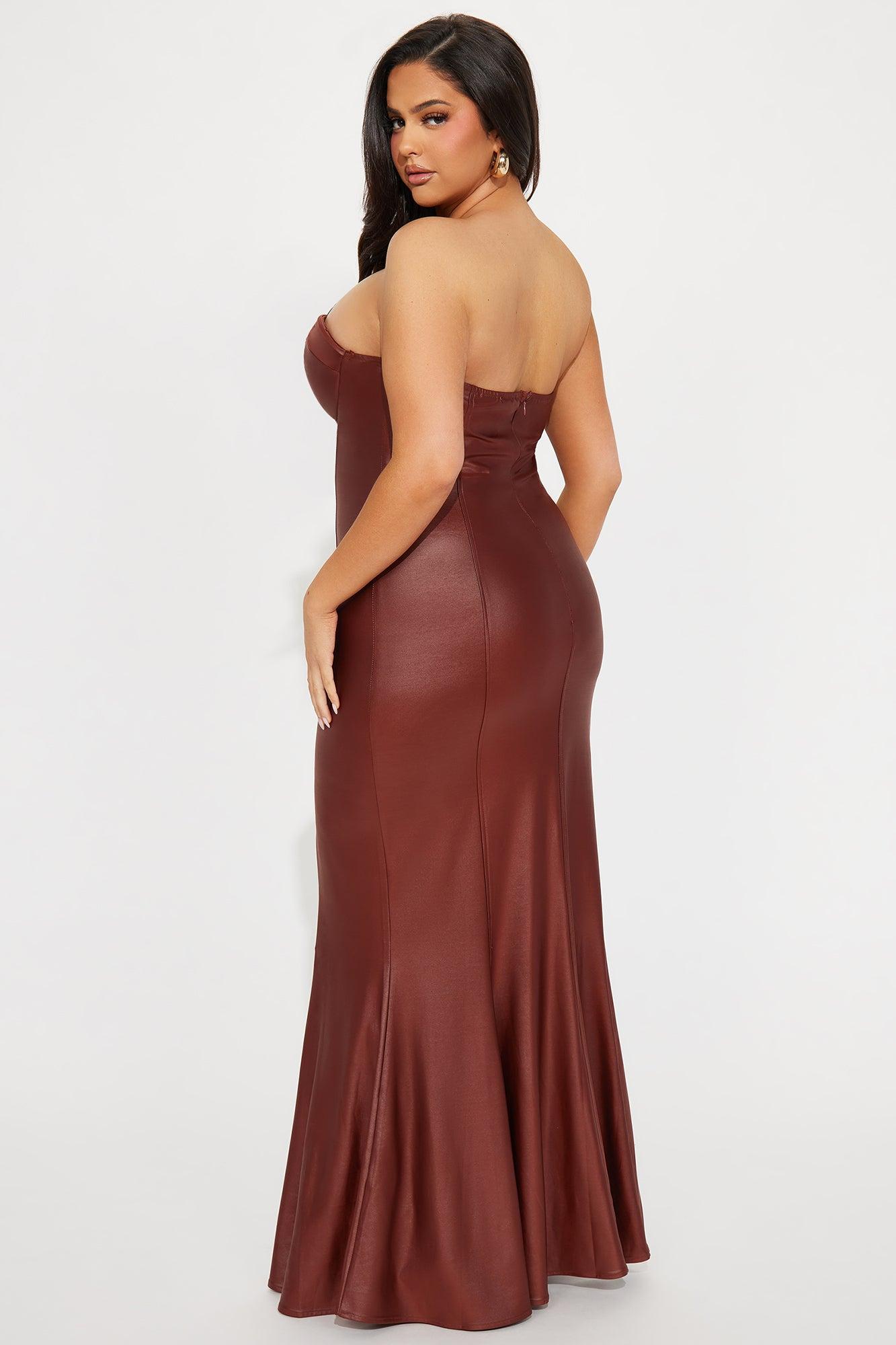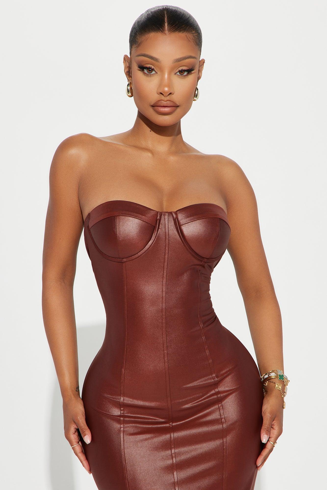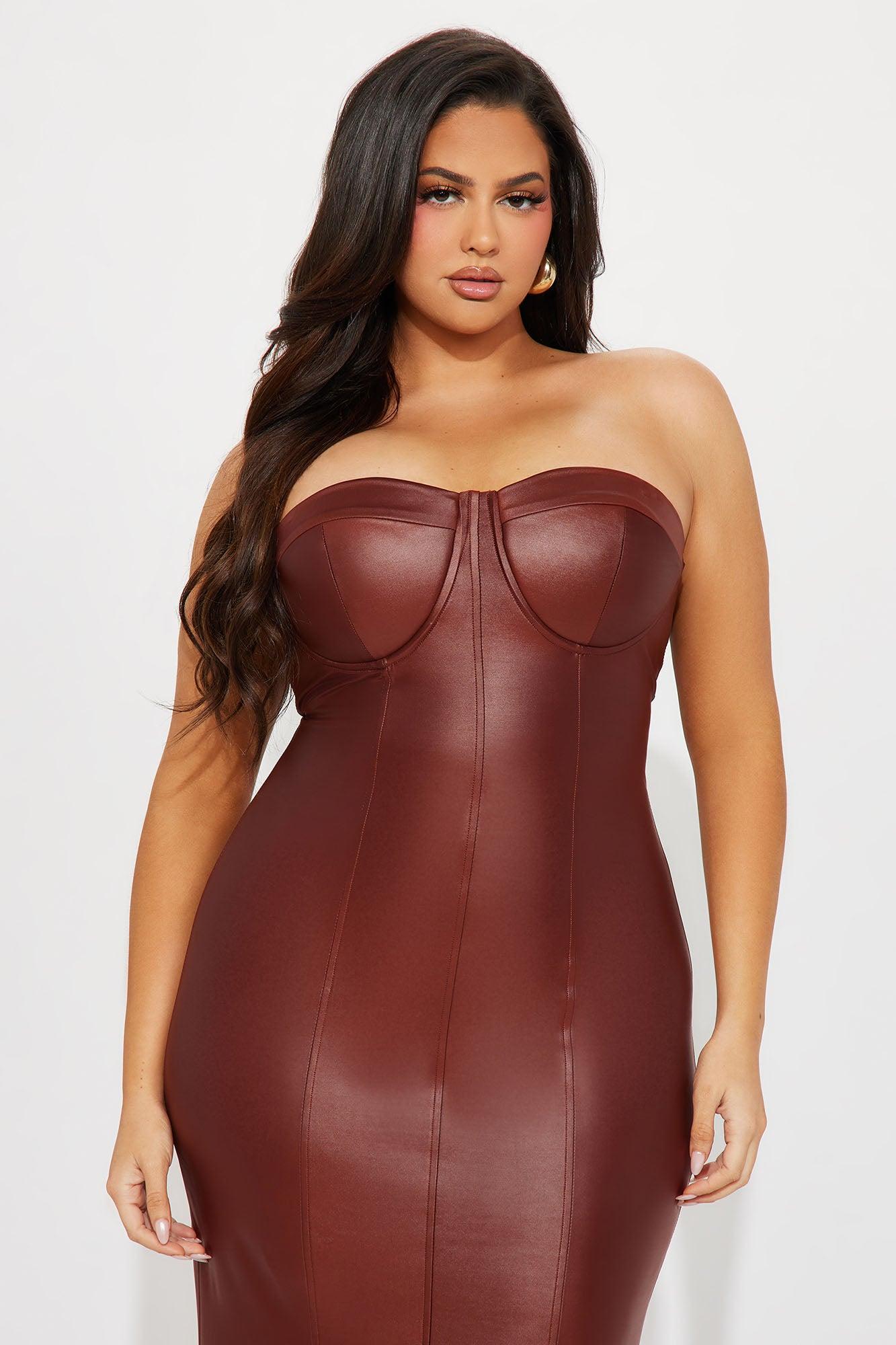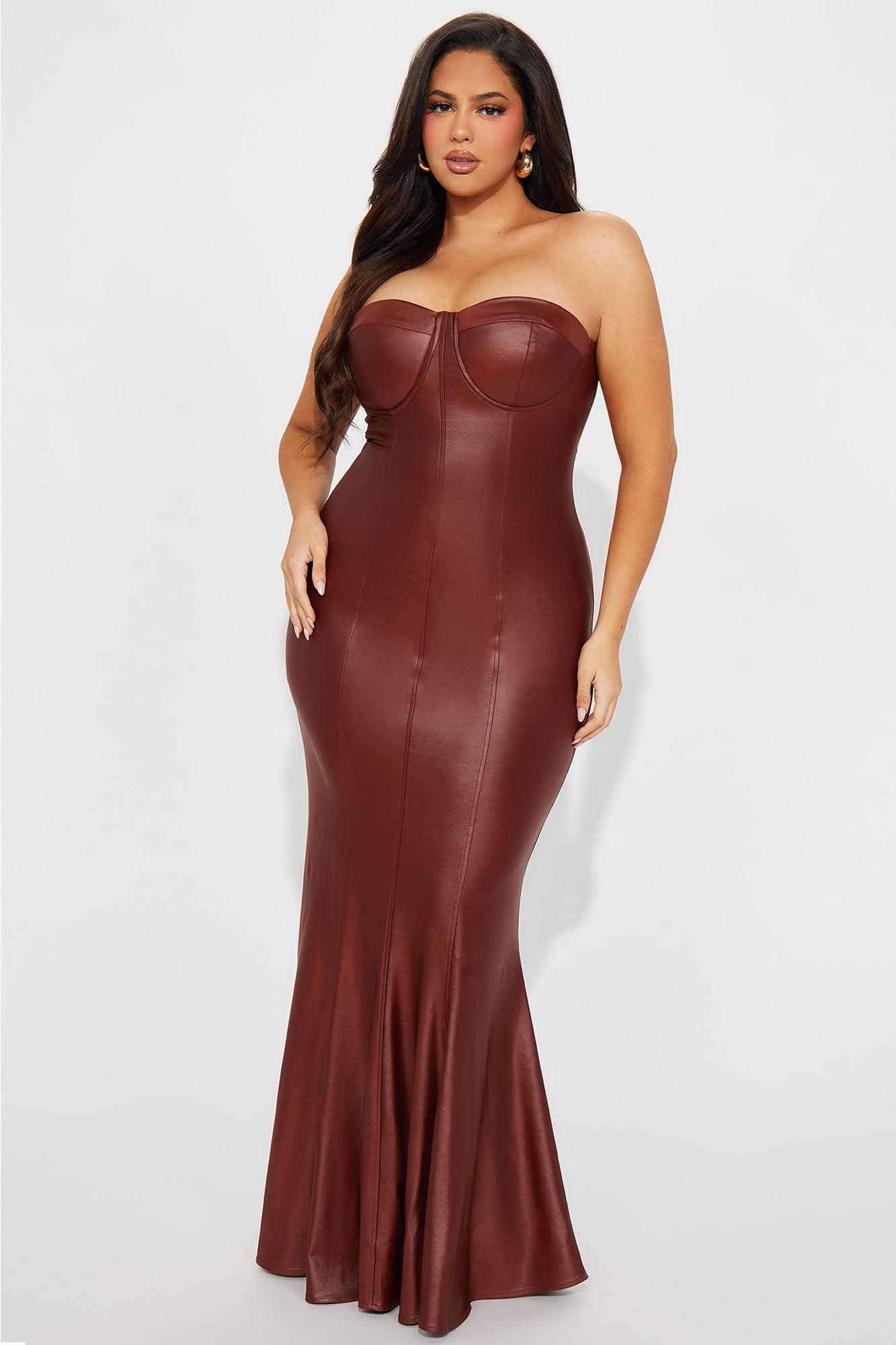 Available In Brown. Faux Leather Maxi Dress Strapless Padded Bra Cups Hidden Back Zipper Stretch Self: 88% Polyester 12% Spandex Lining: 100% Polyester Imported