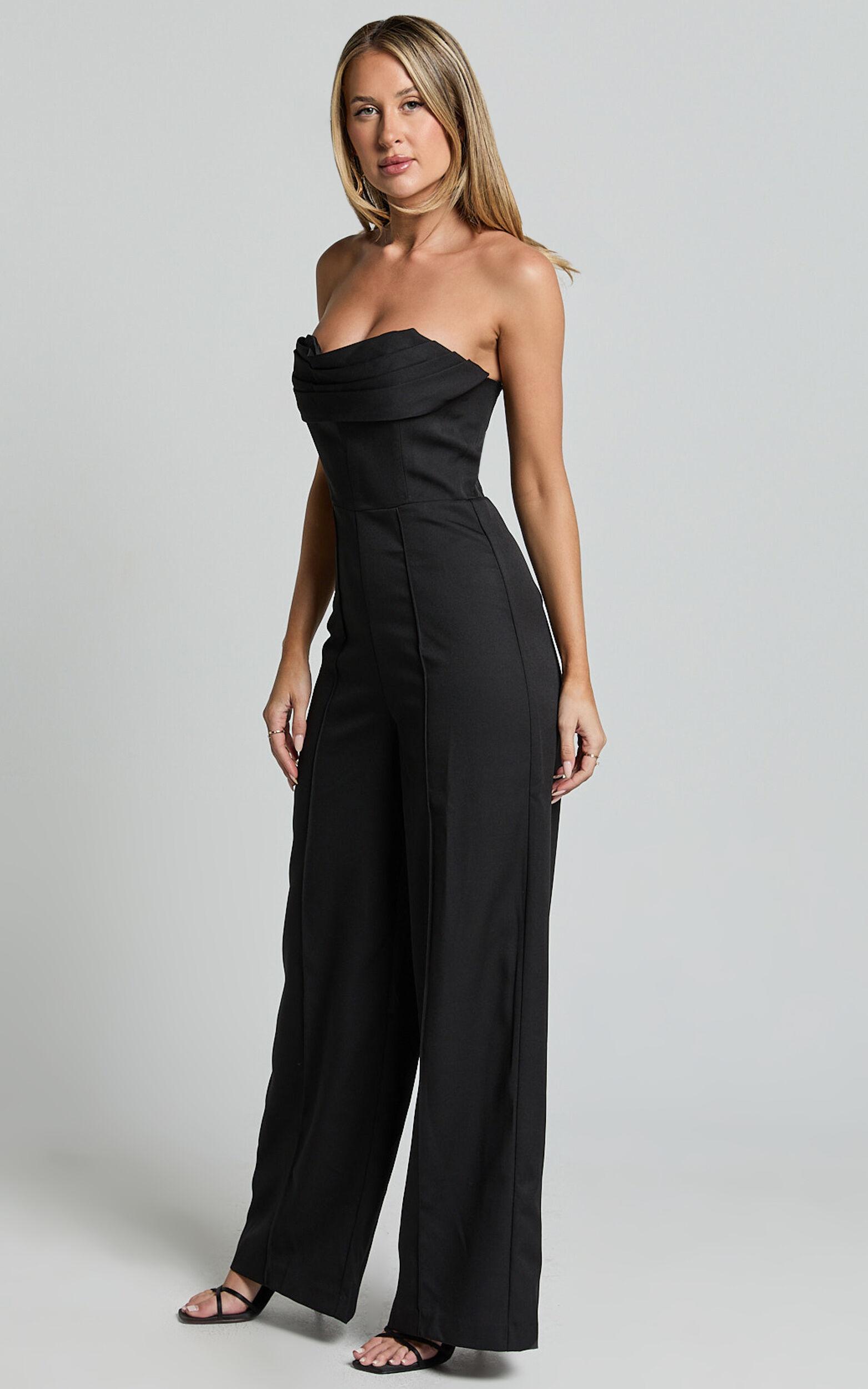 **Stacey Jumpsuit - Strapless Cowl Wide Leg Jumpsuit in Black**Product Details:Wide leg jumpsuitSweetheart necklineStraplessPolyester fabricJersey materialPocketsInner liningZip closureCocktail wearSize and FitSize S / 8 length: 110cm / 43.31inMaterial and Care95% Polyester, 5% SpandexLow Stretch
