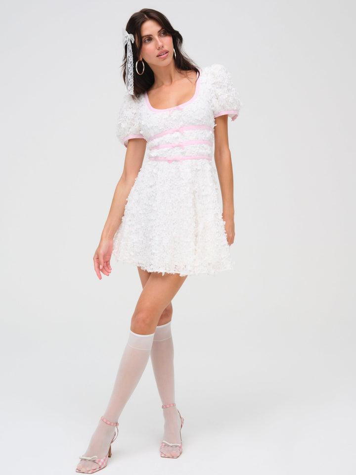 Make a chic, off-beat statement in the Blossom lace mini dress–a puff sleeve mini dress crafted in a dainty all-over stacked blossom lace. Adorned with contrast pink denim bindings and decorative bows, this white mini dress features a fitted bodice and flared skirt for a flattering silhouette.