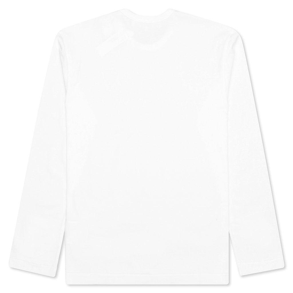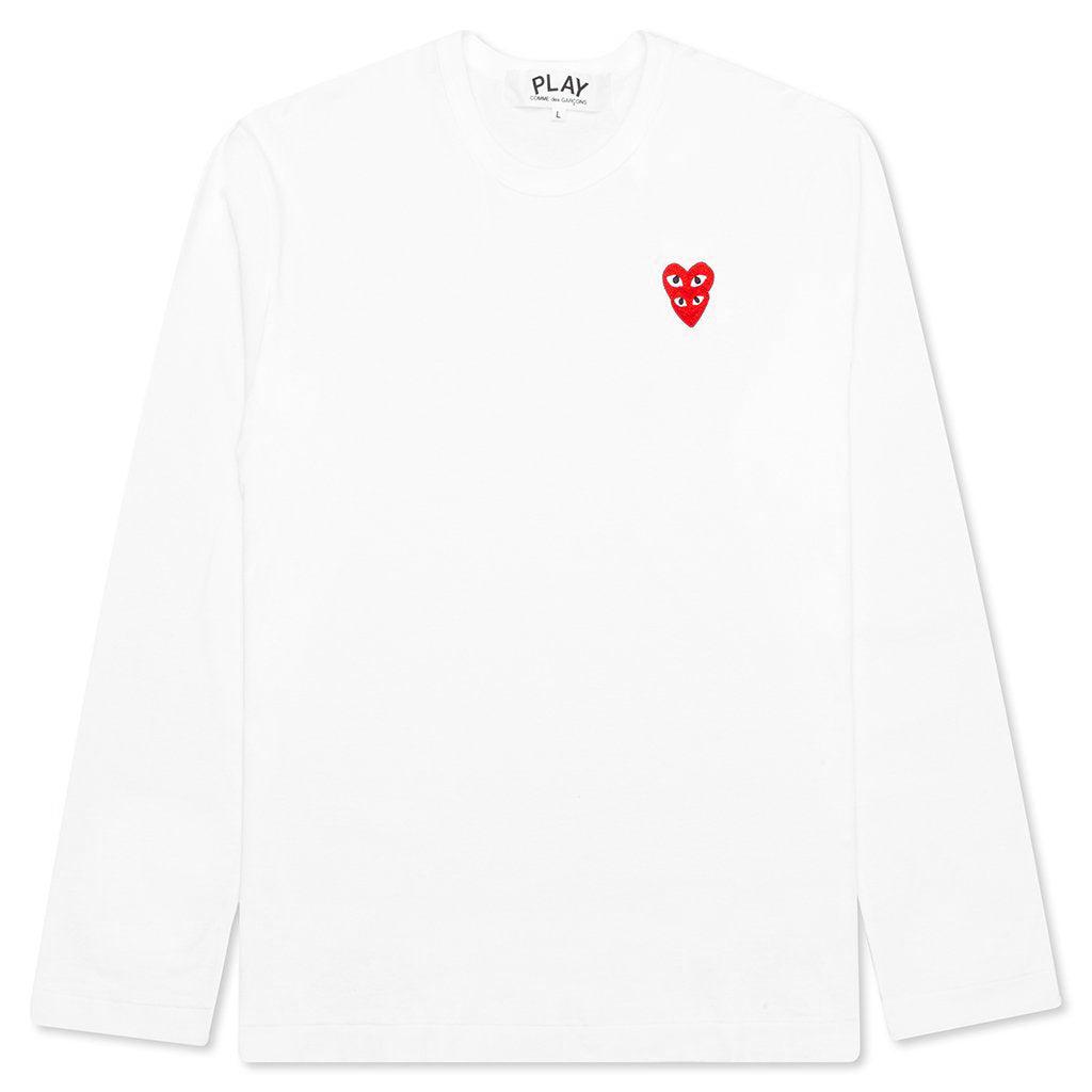The concept of the Comme des Garcons PLAY line is design by not designing. Characterized by the iconic red heart logo designed by artist Filip Pagowski, the line is a collection of unisex basics, fragrances, and footwear for those who enjoy simplicity. Pictured is the Comme des Garcons PLAY Stacked Heart L/S T-Shirt in White. COMME DES GARCONS PLAY APPAREL HAS A SMALLER FIT, WE RECOMMEND SIZING UP. THIS ITEM IS NOT ELIGIBLE FOR DISCOUNTS OR SPECIAL PROMOTIONS. 100% Cotton Ribbed crewneck Embroidered details Made in Japan Style no: AZ-T292-051-2 condition: new