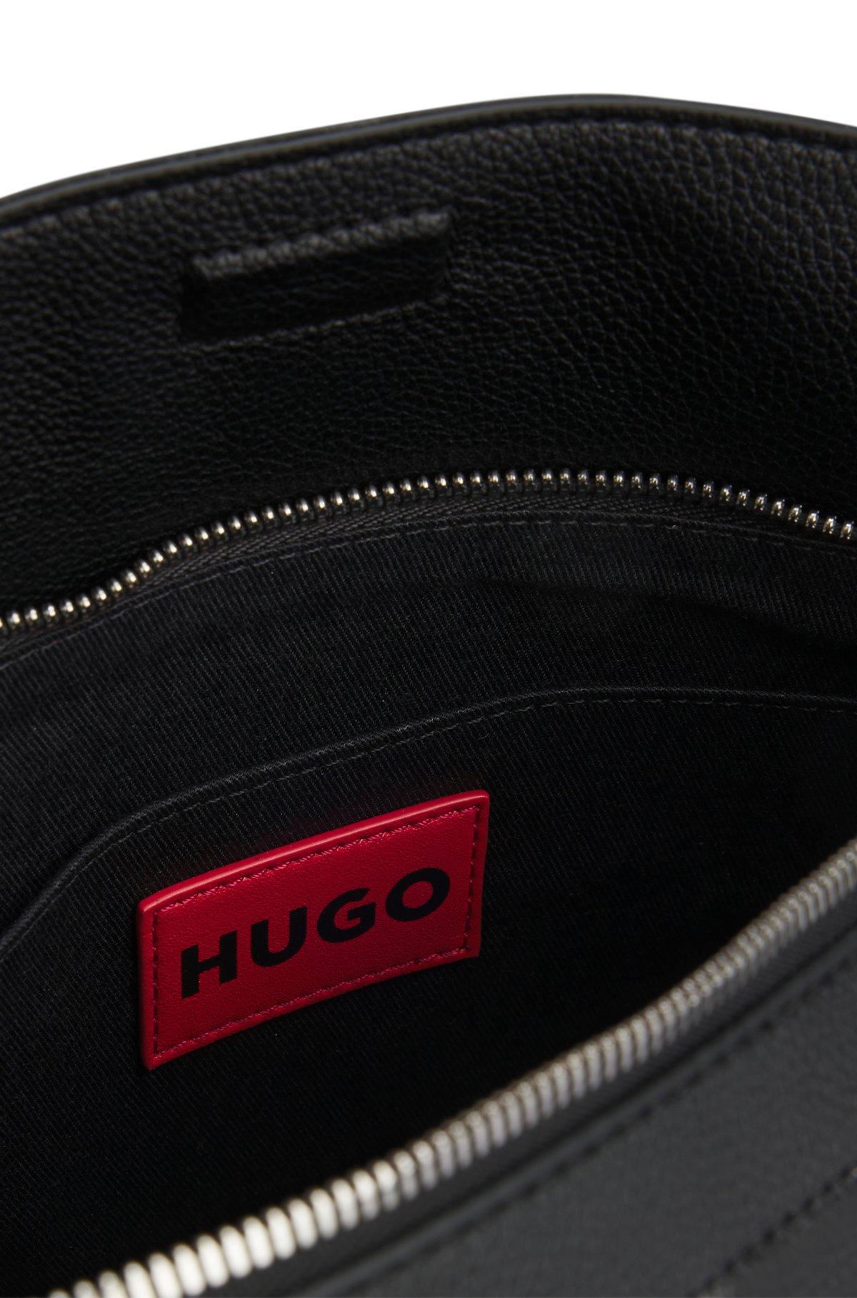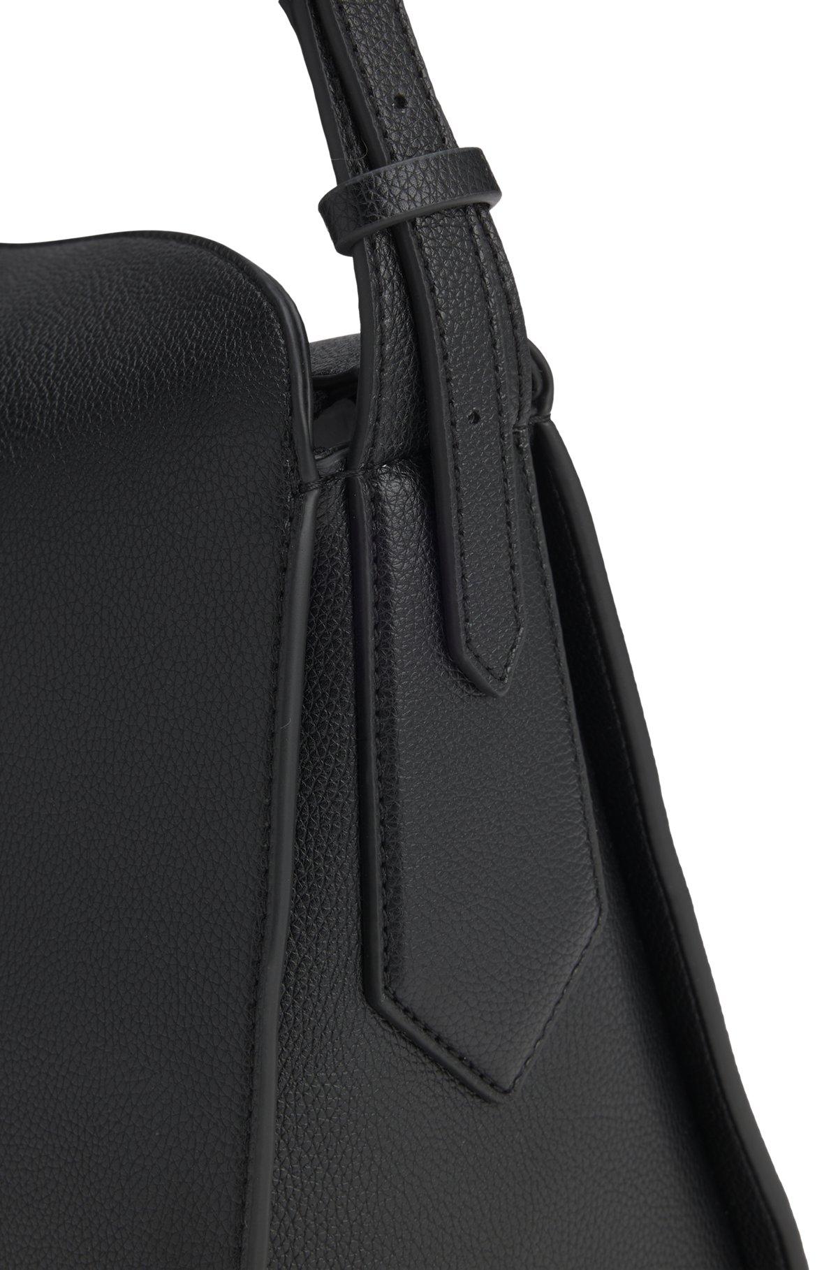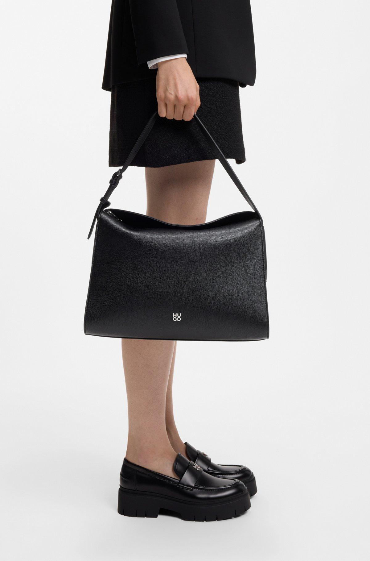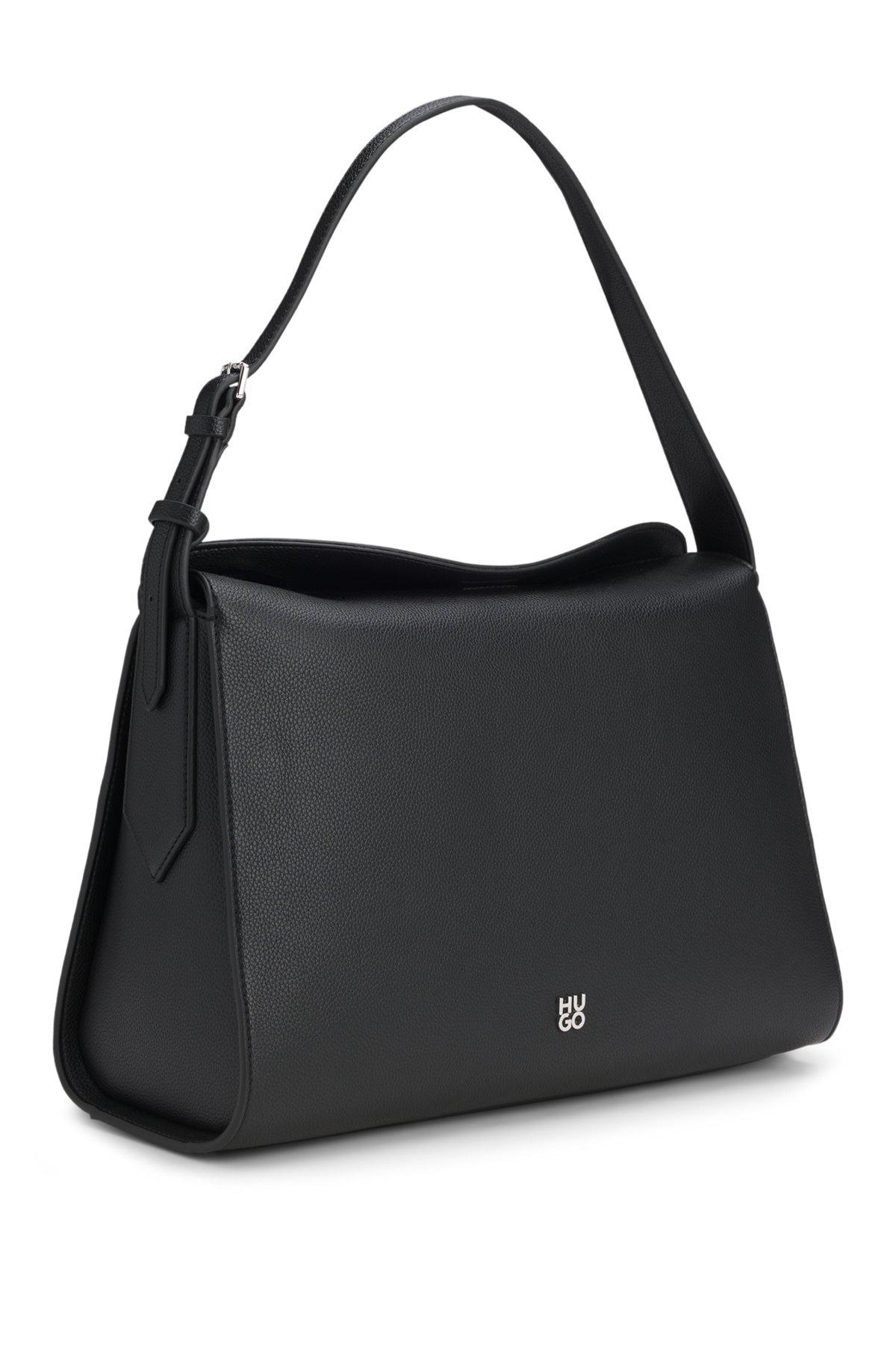 Featuring a stacked logo for a distinctive touch, this minimalist HUGO Womenswear shoulder bag will complete any look. Synthetic coated fabric with a subtle grain. Synthetic coated fabric, sometimes referred to as faux leather, is a fabric designed to resemble real leather, and/or display a matte, glossy, smooth, or textured, coated appearance. Measurements: 23 x 13.5 x 34cm