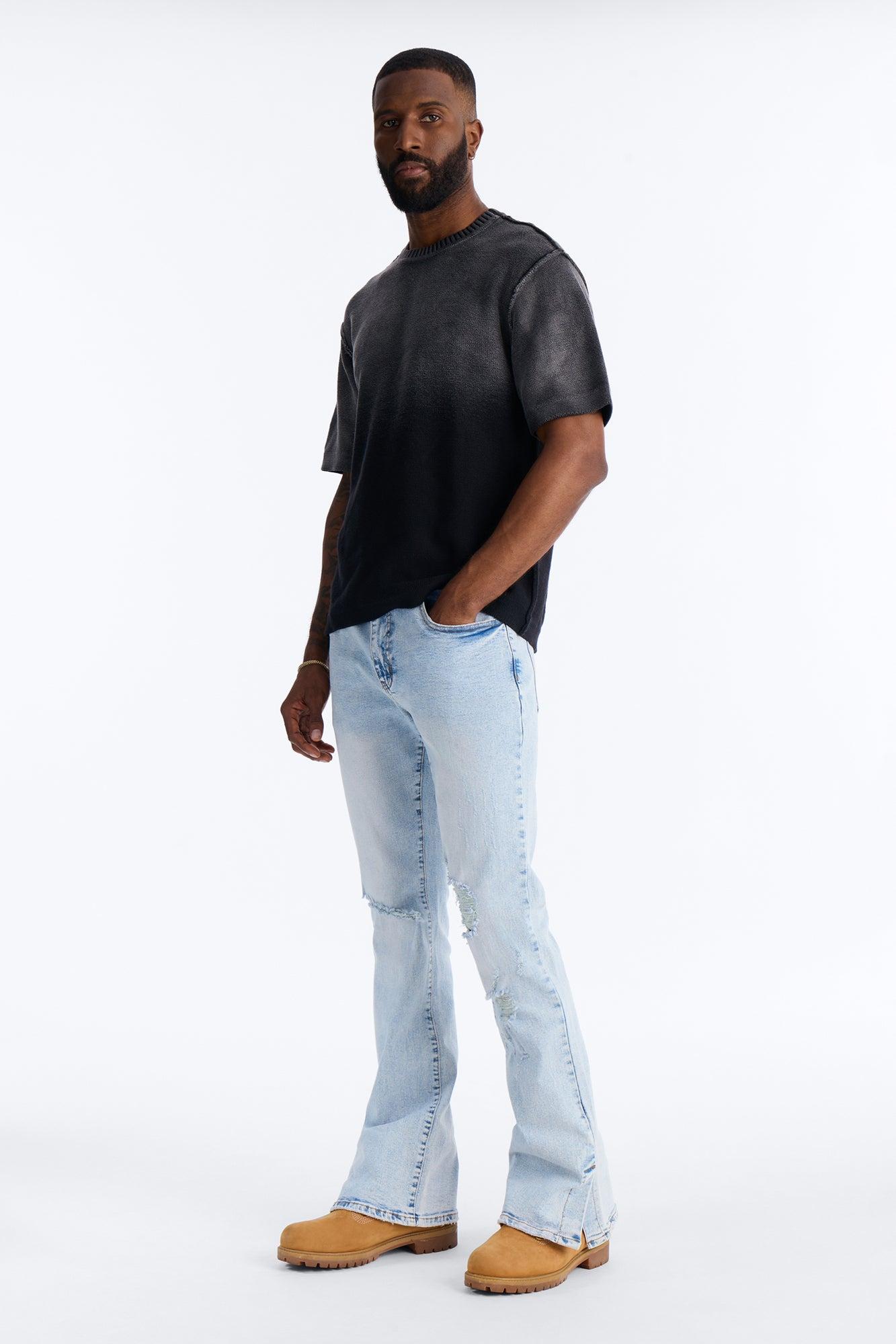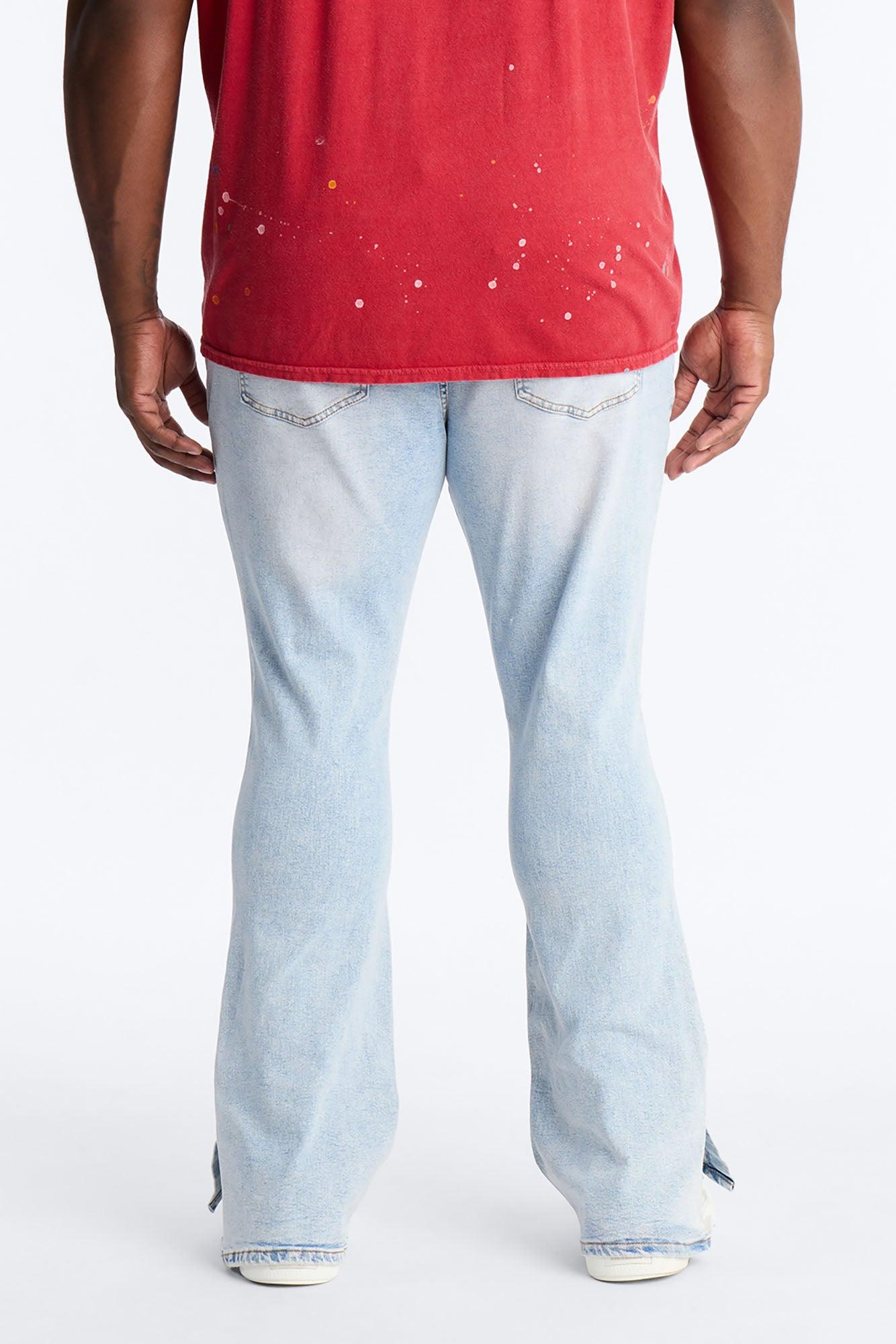 Available In Dark Brown, Grey And Light Blue Wash. Slim Stacked Flare Fit Side Slit Zipper Fly With Button Closure Distressed Disclaimer: Due To The Specialized Wash & Distressing Process, Each Garment Is Unique. Self: 65% Cotton 33% Polyester 2% Spandex Imported