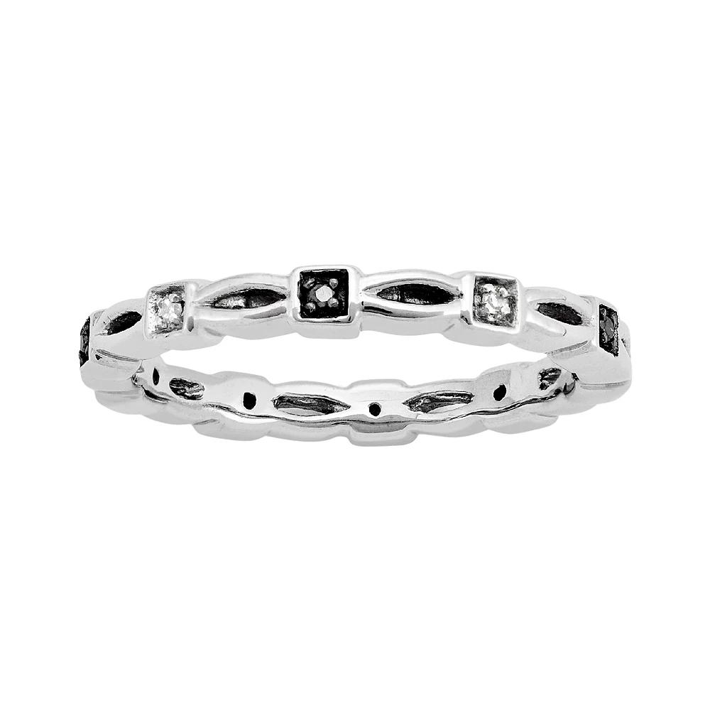 Black and white diamond accents give this sterling silver stack ring a dazzling glow.Ring Details: Width: 2.5-mm Metal: black & white rhodium-plated sterling silver Diamond Details: Carat total weight: less than 1/10 Cut: round Color: black & white Setting: prong Image(s) may be enlarged to show detail. Diamond weights are approximate. Diamond total weights may vary between .01 and .08 ct. Some diamonds have fewer than 17 facets. Gemstones may have been treated to enhance their appearance. Special care may be required. Please visit our Gemstone Treatment & Special Care Guide for more information. Color: Multicolor. Gender: female. Age Group: adult.