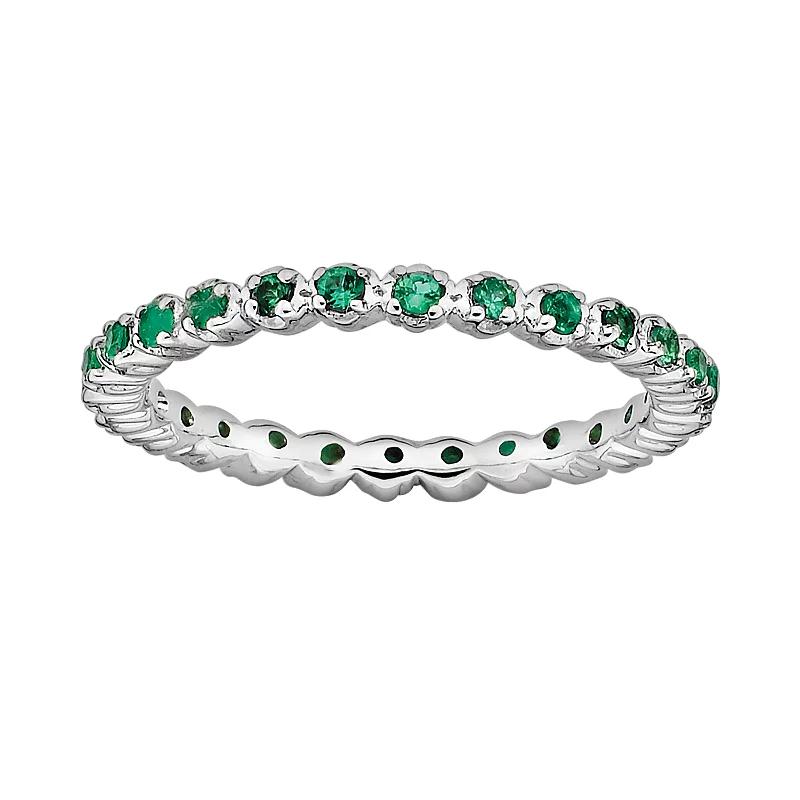 Splash a bit of colorful allure to your style with this May birthstone stackable ring. Styled in sterling silver, this 2.25mm wide Stackable Expressions ring features 1/3 ct. t.w. round created green emerald gemstones all around along with high polished finish for sparkling shine. Perfect to wear alone or next to your other bands, this ring available in finger size 6. | Belk & Co Lab Created 1/3 Ct. T.w. Created Emerald Stackable Expressions Ring In Sterling Silver, White, 8
