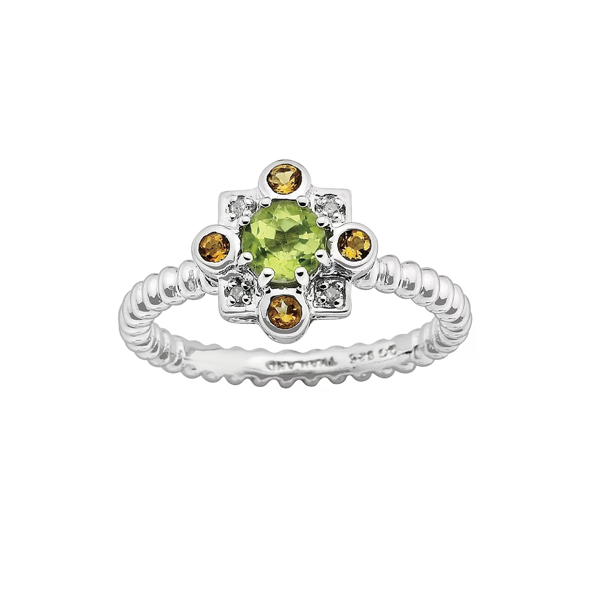 Featuring peridot and citrine stones, this sterling silver stack ring adds vibrant beauty to any ensemble.Ring Details: Width: .43-in. Metal: rhodium-plated sterling silver Features: beaded band Stone Details: Stone type: genuine peridot & genuine citrine Cut: round Setting: prong & bezel Diamond Details: Carat total weight: less than 1/10 Cut: round Setting: bezel Image(s) may be enlarged to show detail. Diamond weights are approximate. Diamond total weights may vary between .01 and .08 ct. Some diamonds have fewer than 17 facets. Gemstones may have been treated to enhance their appearance. Special care may be required. Please visit our Gemstone Treatment & Special Care Guide for more information. Color: Multicolor. Gender: female. Age Group: adult.