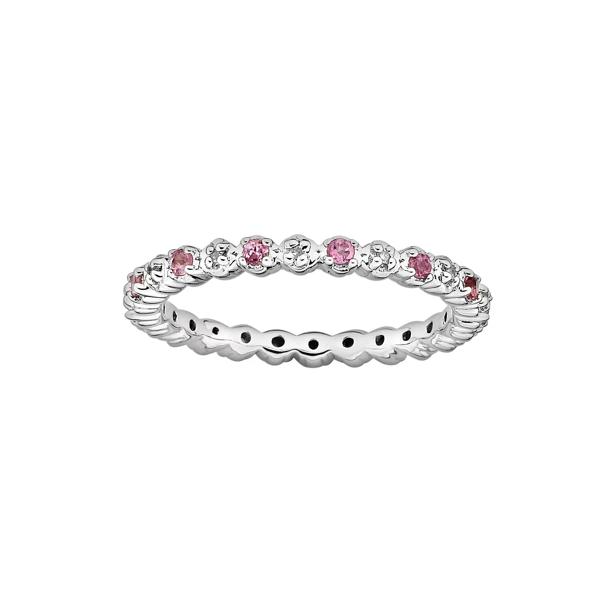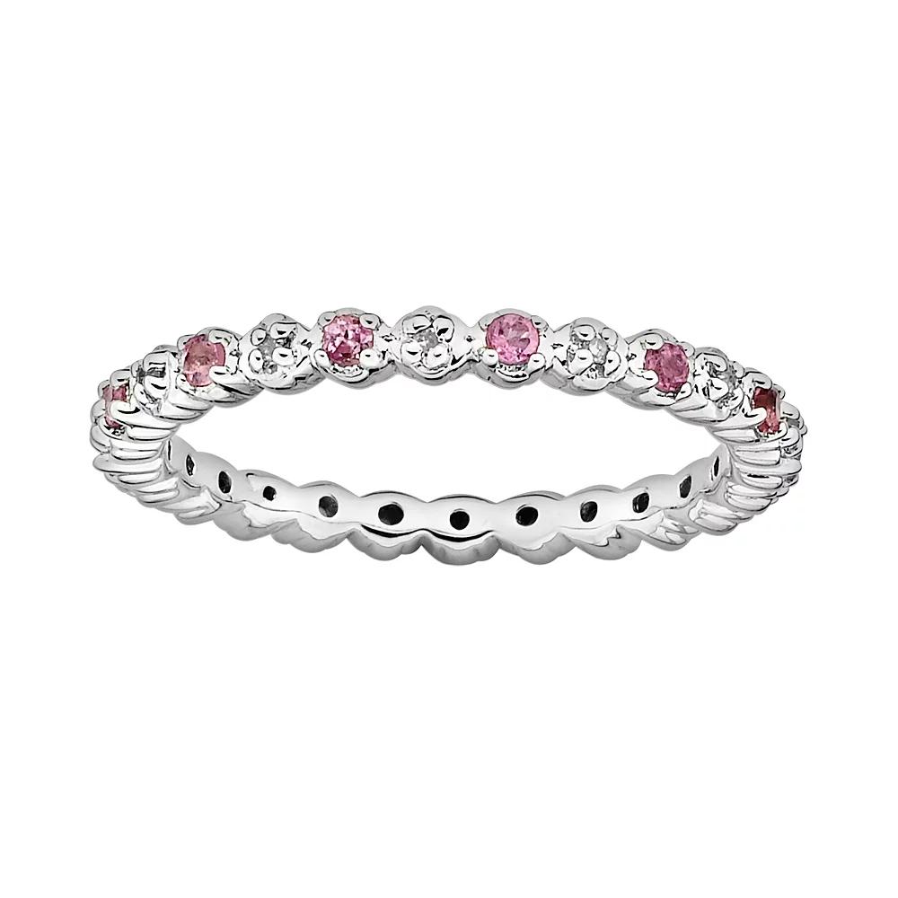 Perfect for a sharp yet chic look this stackable ring is fashioned in sterling silver with gleaming polished finish. From Stackable Expressions, this 2.25mm wide eternity ring features an array of 1/4 ct. t.w. round pink tourmaline gemstones and sparkling 0.05 ct. t.w. diamonds placed alternatively to enhance your everyday look. Comes in finger size 9, this October birthstone ring can we worn alone or in a group with other rings. | Belk & Co 1/5 Ct. T.w. Pink Tourmaline And 1/10 Ct. T.w. Diamond Stackable Expressions Ring In Sterling Silver, White, 7