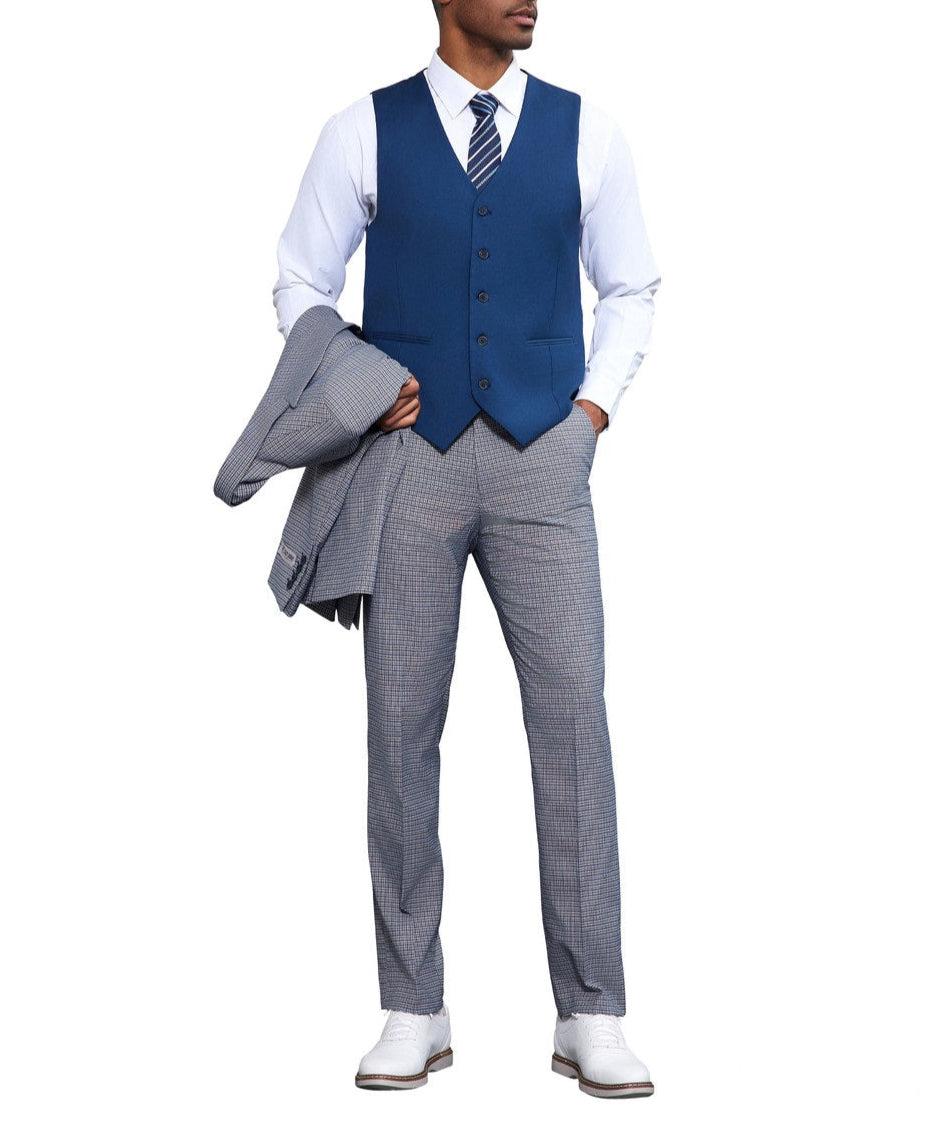 Jacket Glen Plaid Hybrid Fit Peak Lapel One Button Closure Side Vents Interior French Facing Two Besom Front Pockets with Flap Closure Three Interior Pockets Underarm Sweat Guards Vest Solid Color (Blue) Five Button Closure Two Side Slit Pockets Pants Glen Plaid Flat Front Two Back Besom Pockets with Button Closure Two Front Angled Slip Pockets Adjustable Waistband
