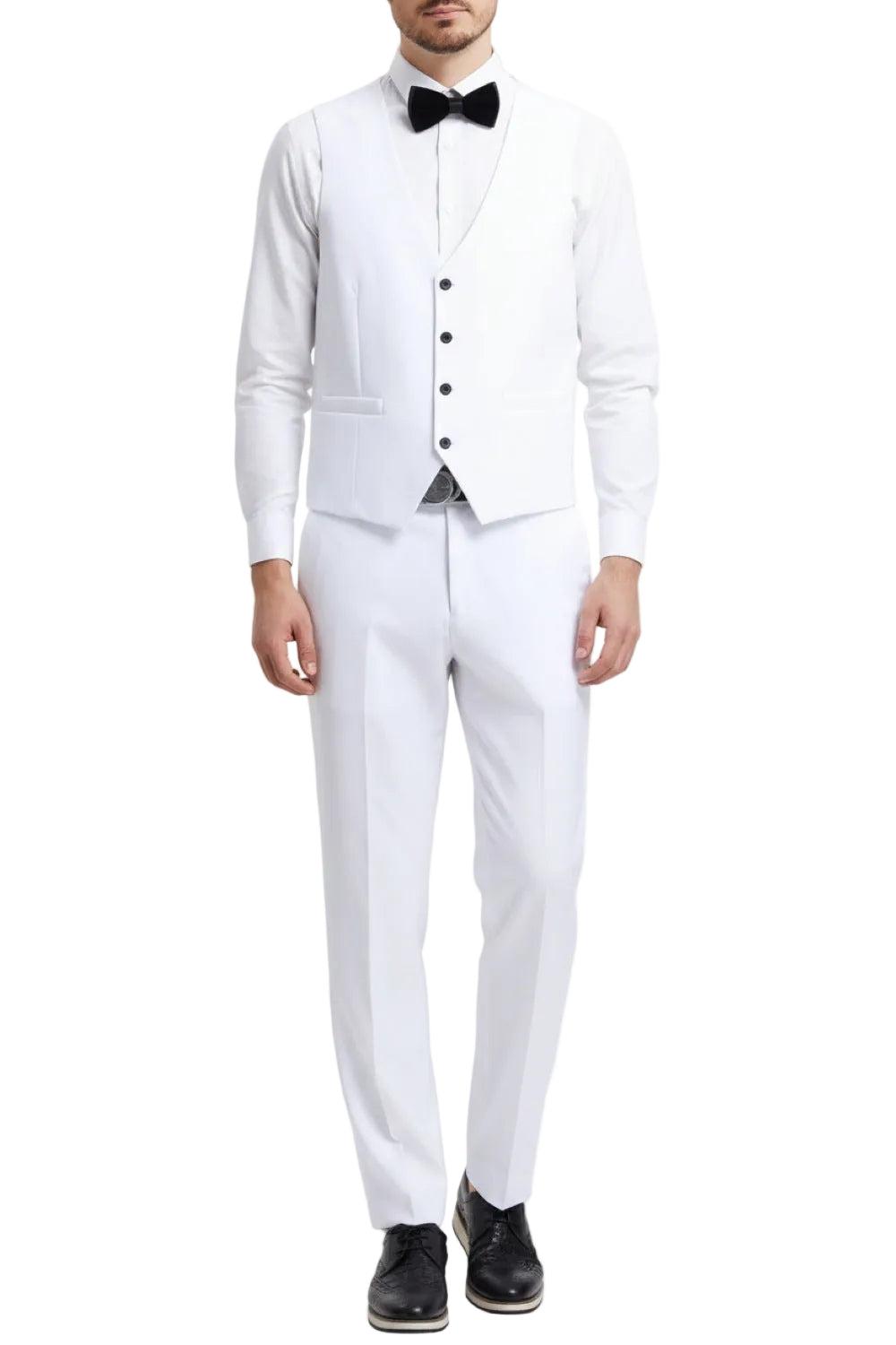 Jacket Solid One Button Front Closure Hybrid Fit Satin Shawl Collar Interior French Facing Two Front Flap Pockets With Satin Trim Three Interior Pockets Underarm Sweat Guards Vest Solid Four Button Closure Side Slit Pockets Pants Flat Front Two Back Besom Pockets with Button Closure Two Front Angled Slip Pockets