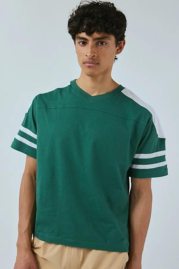 Game day tee by Standard Cloth with tonal mesh paneling. This cotton-blend t-shirt is cut in a boxy silhouette with a cropped length hem. Urban Outfitters exclusive. Features Standard Cloth Touchdown boxy mesh tee V-neckline Tonal mesh paneling Short sleeve Boxy silhouette Cropped length UO exclusive Content + Care 99% Cotton, 1% polyester Machine wash Imported Size + Fit Model in Grey Multi is 61 and wearing size Medium Measurements taken from size Medium Chest: 44 Length: 24 Standard Cloth Touchdown Boxy Mesh Tee in Green, Mens at Urban Outfitters